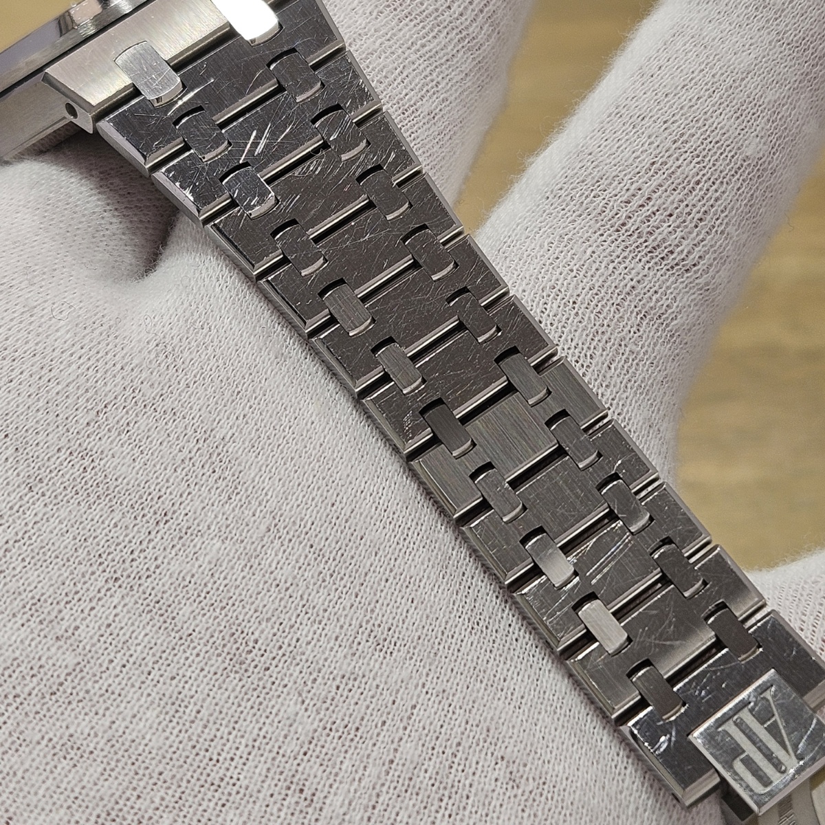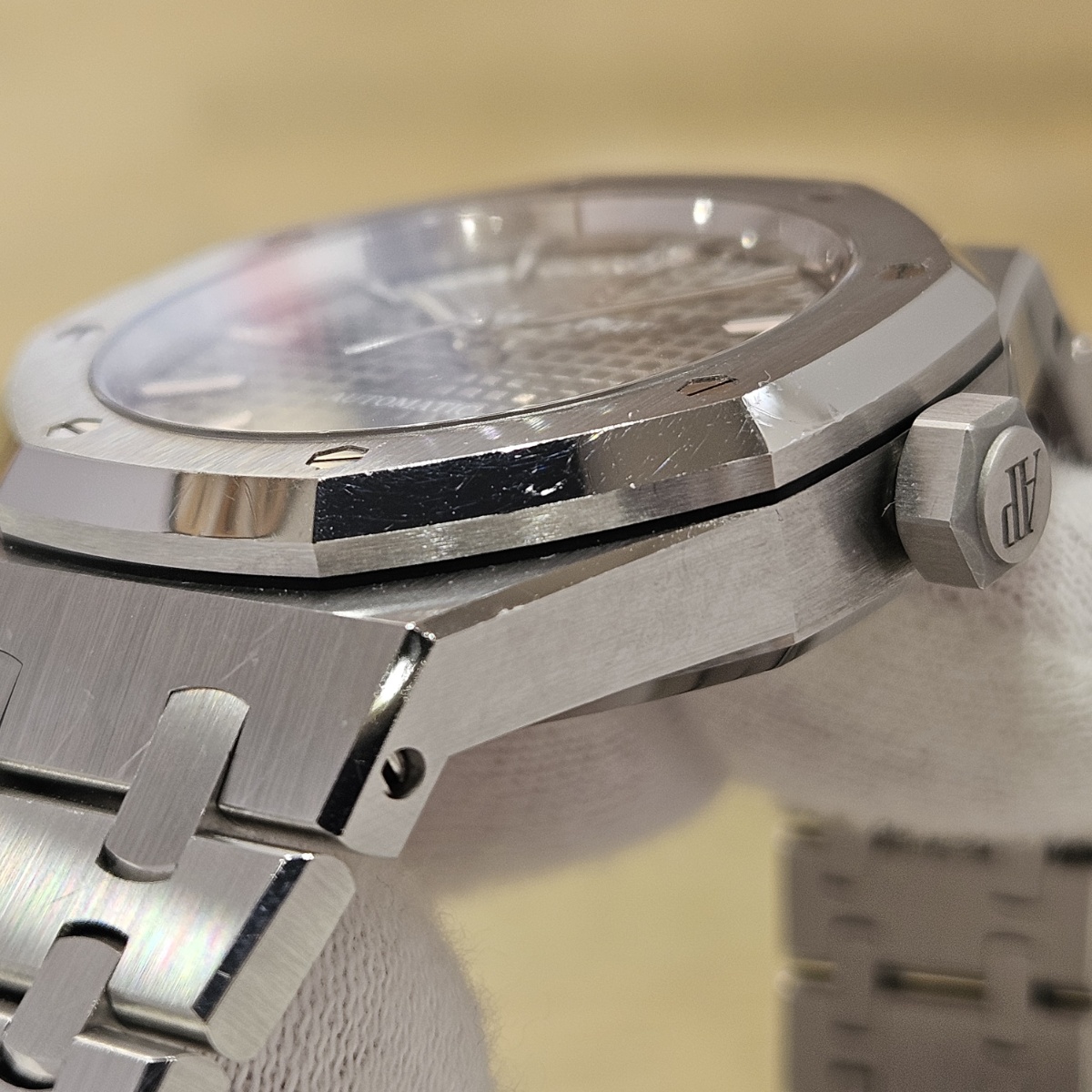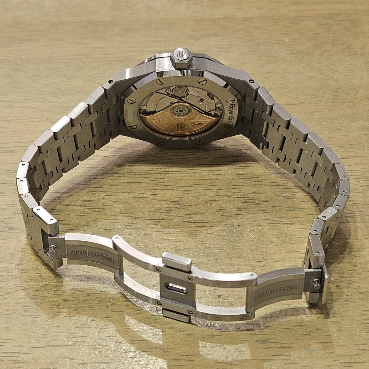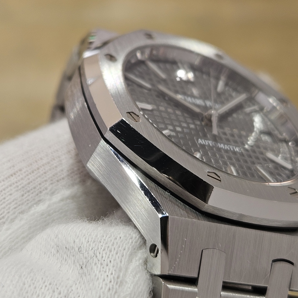 | コメント | 2019年8月。昔はあったのに見かけないモデルになってしまった15450STの入荷です。今回はワントーンで洋服にも合わせやすいルテニウムグレーの入荷です。ジャガールクルトベースのcal.3120を搭載した最後のモデルとなっておりまして、実際に使用してみるとスイッチングローカー式ですので巻き上げ効率が尋常では無いのが魅力です。デスクワークの方でも巻き上げが早く止まりにくい自動巻きムーブメントとなっております。今回の個体は使用傷は多数ございますが外装仕上げのはいっていないノンポリッシュ品となりましてエッジの切れ立つようなフォルムがそのままに残っております。フルコマ、完備品となりますので使用するので多少の傷は気にならないという方は是非お問い合わせ下さい。 |