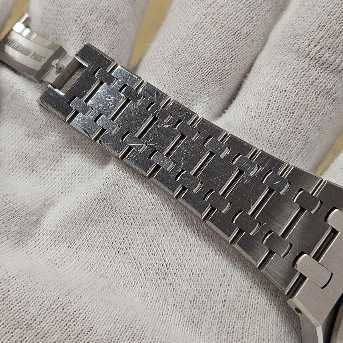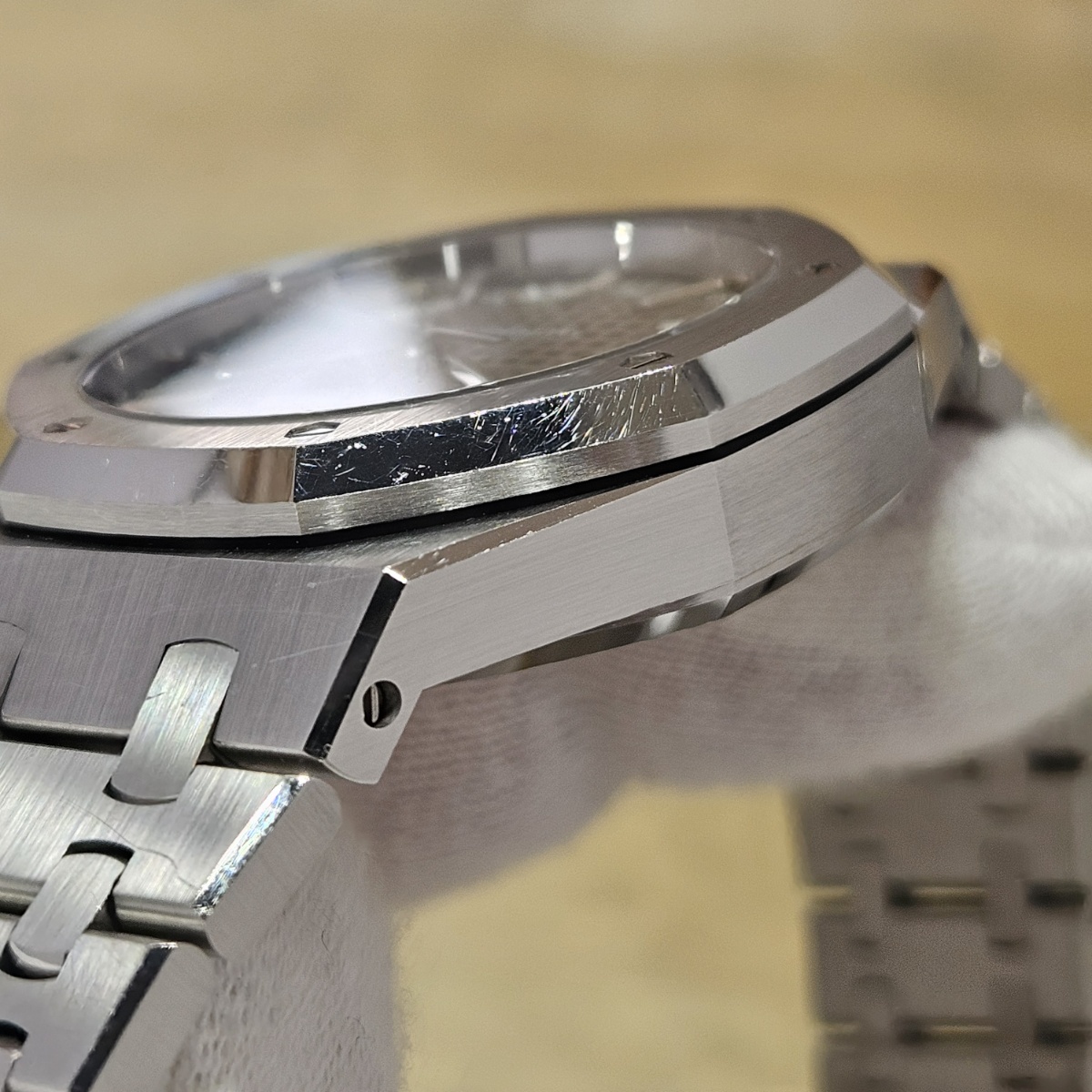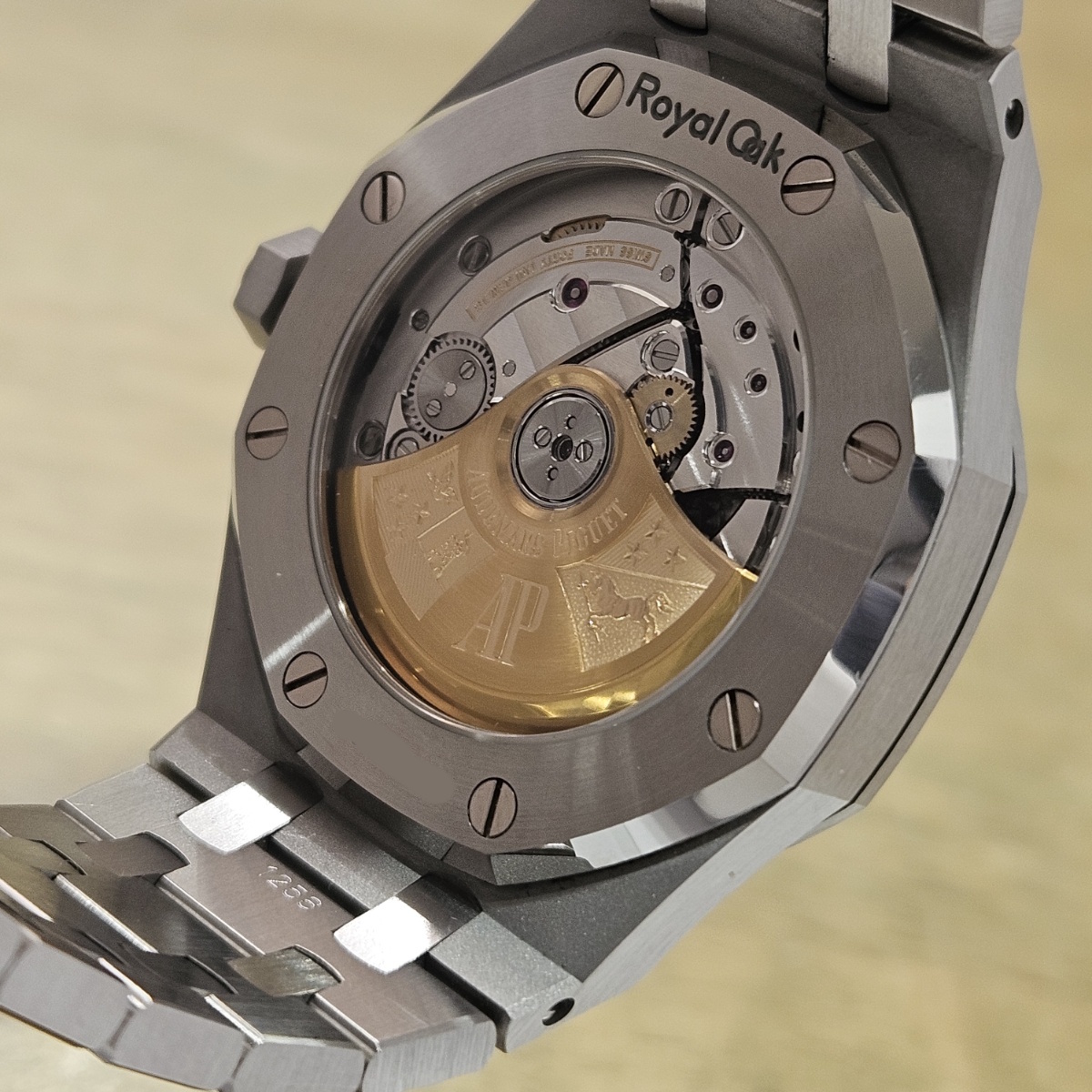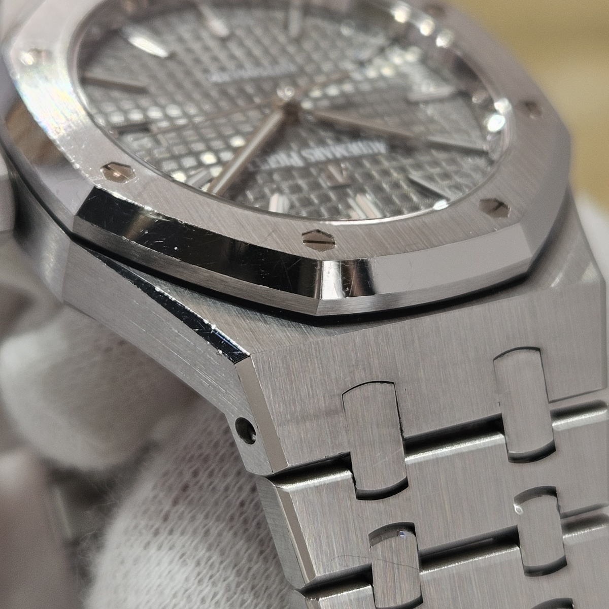 | コメント | 2019年8月。昔はあったのに見かけないモデルになってしまった15450STの入荷です。今回はワントーンで洋服にも合わせやすいルテニウムグレーの入荷です。ジャガールクルトベースのcal.3120を搭載した最後のモデルとなっておりまして、実際に使用してみるとスイッチングローカー式ですので巻き上げ効率が尋常では無いのが魅力です。デスクワークの方でも巻き上げが早く止まりにくい自動巻きムーブメントとなっております。今回の個体は使用傷は多数ございますが外装仕上げのはいっていないノンポリッシュ品となりましてエッジの切れ立つようなフォルムがそのままに残っております。フルコマ、完備品となりますので使用するので多少の傷は気にならないという方は是非お問い合わせ下さい。 |