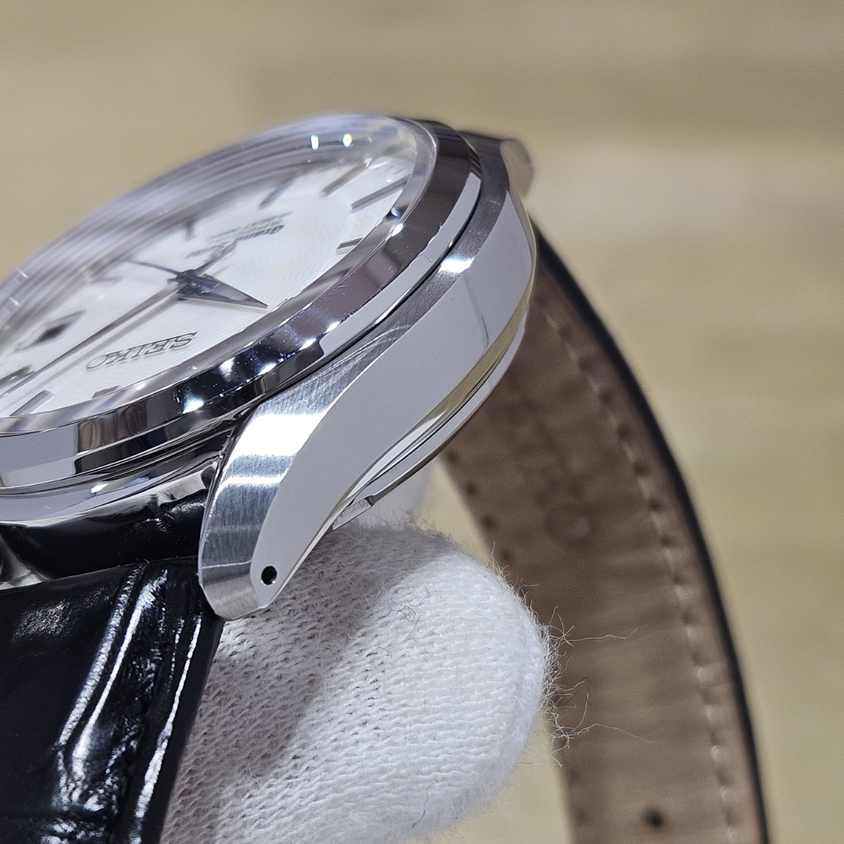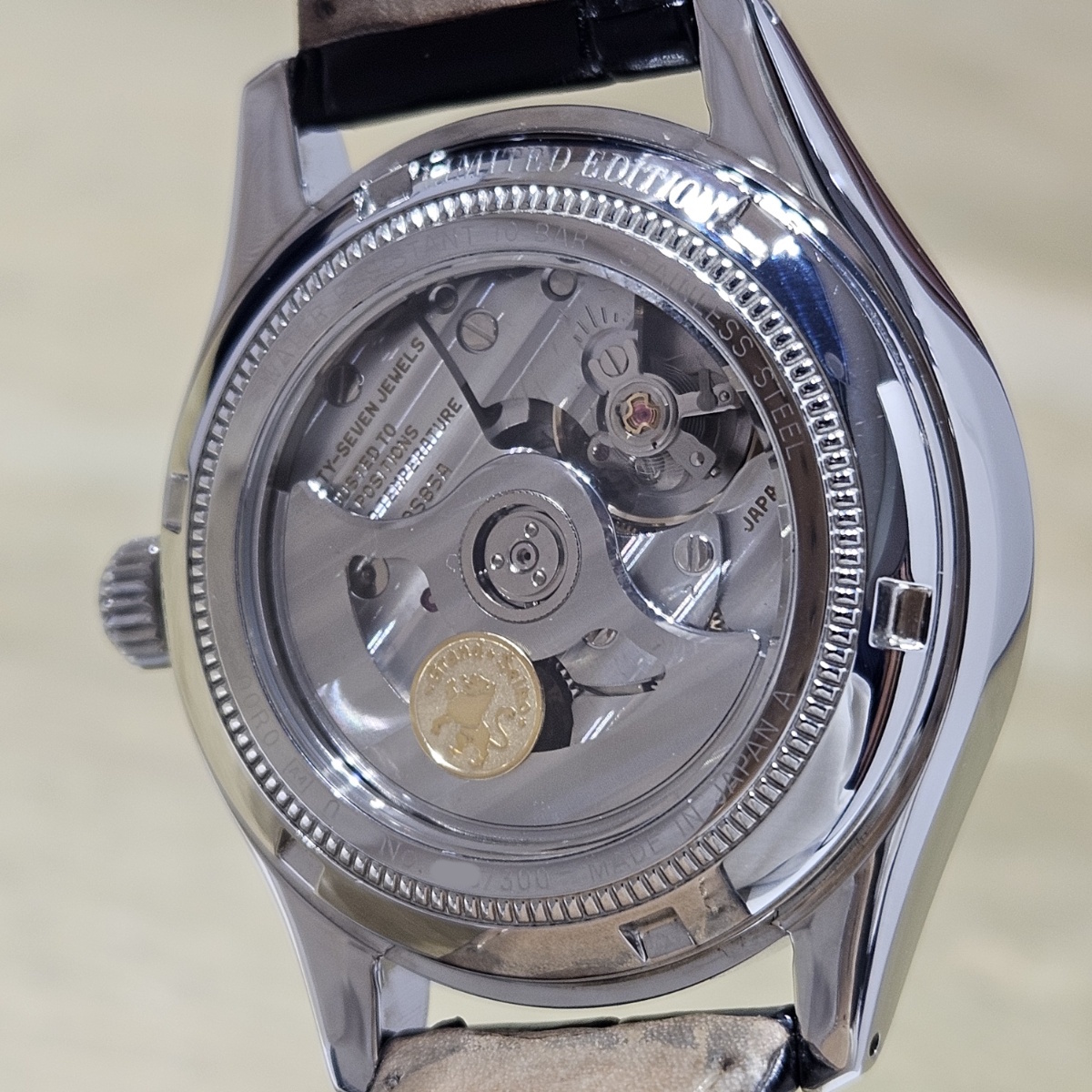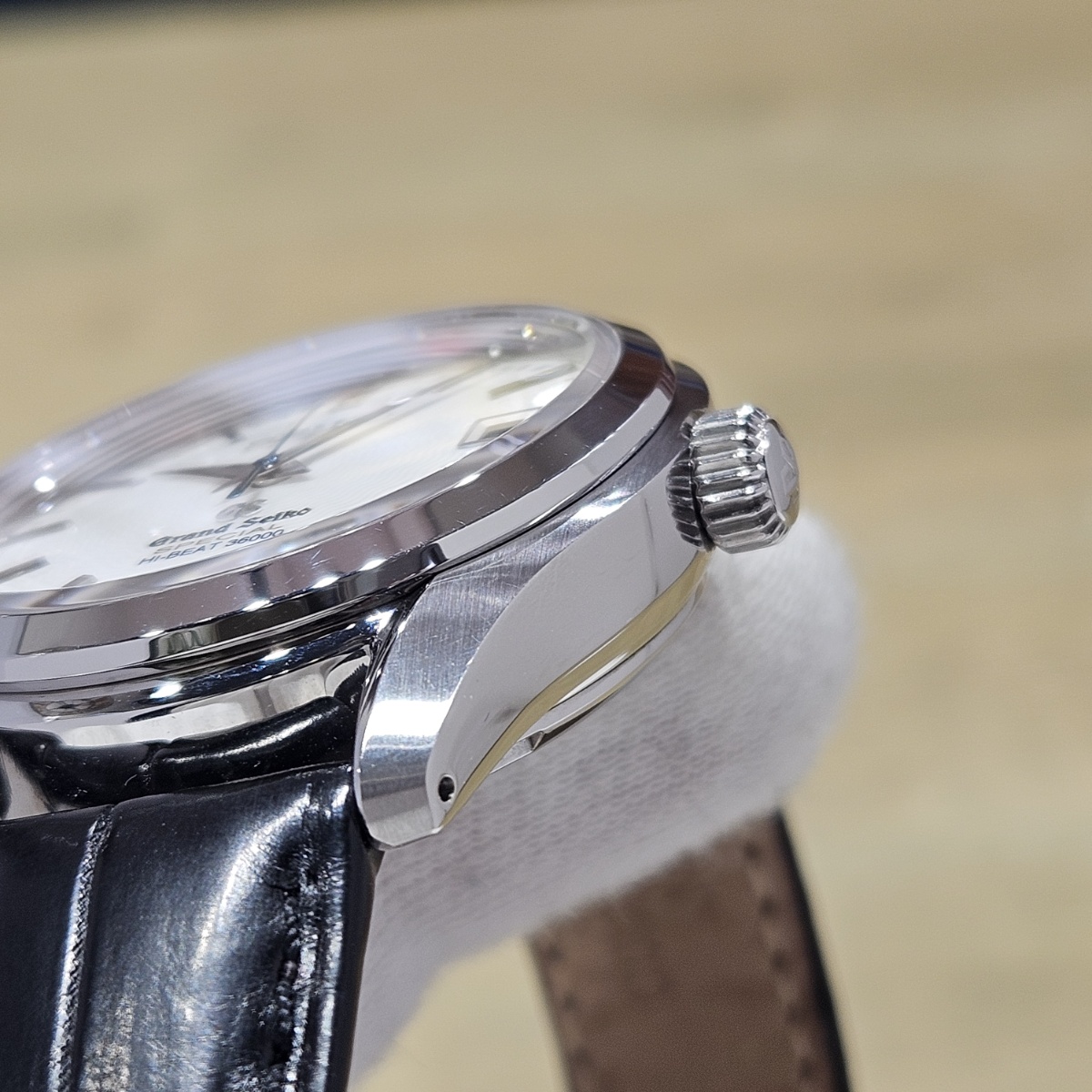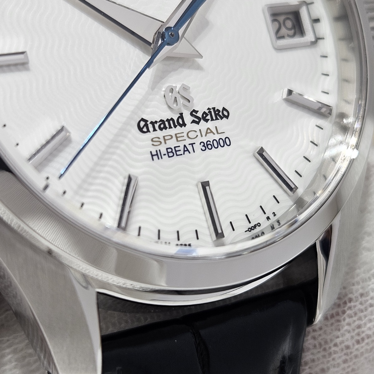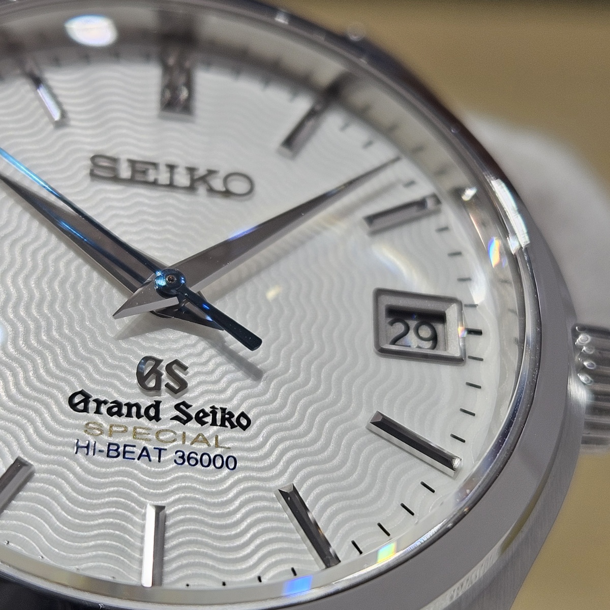 2015年10月スペシャルサロン限定300本モデル。文字盤には中央から広がる波型の模様に文字盤にはGSスペシャル規格検定を通過した「SPECIAL」の文字にシェイプしたラグは往年の61GSスペシャルを思わせる造形です。裏面は金獅子ローターとなっておりまして中身の機械も+4秒~-2秒以内の精度を出荷基準とするグランドセイコースペシャル規格の特別に調整されたムーブメントとなります。本当に極少数しか製造されていないグランドセイコースペシャルになりまして今回は文字盤に放射状の枯山水を思わせるようなギョーシェ文字盤となっております。6時位置に黄金に輝くSPECIALの文字は最高精度ムーブメントを積んでいる証明となります。定価入りの新品タグまで残っているコレクターズコンディションとなります。新品時の純正ベルトも僅かなダメージはありますがそのまま現存しておりますし、38mmという絶妙なサイズ感となりますのでお探しの方は是非お問い合わせ下さい。 |