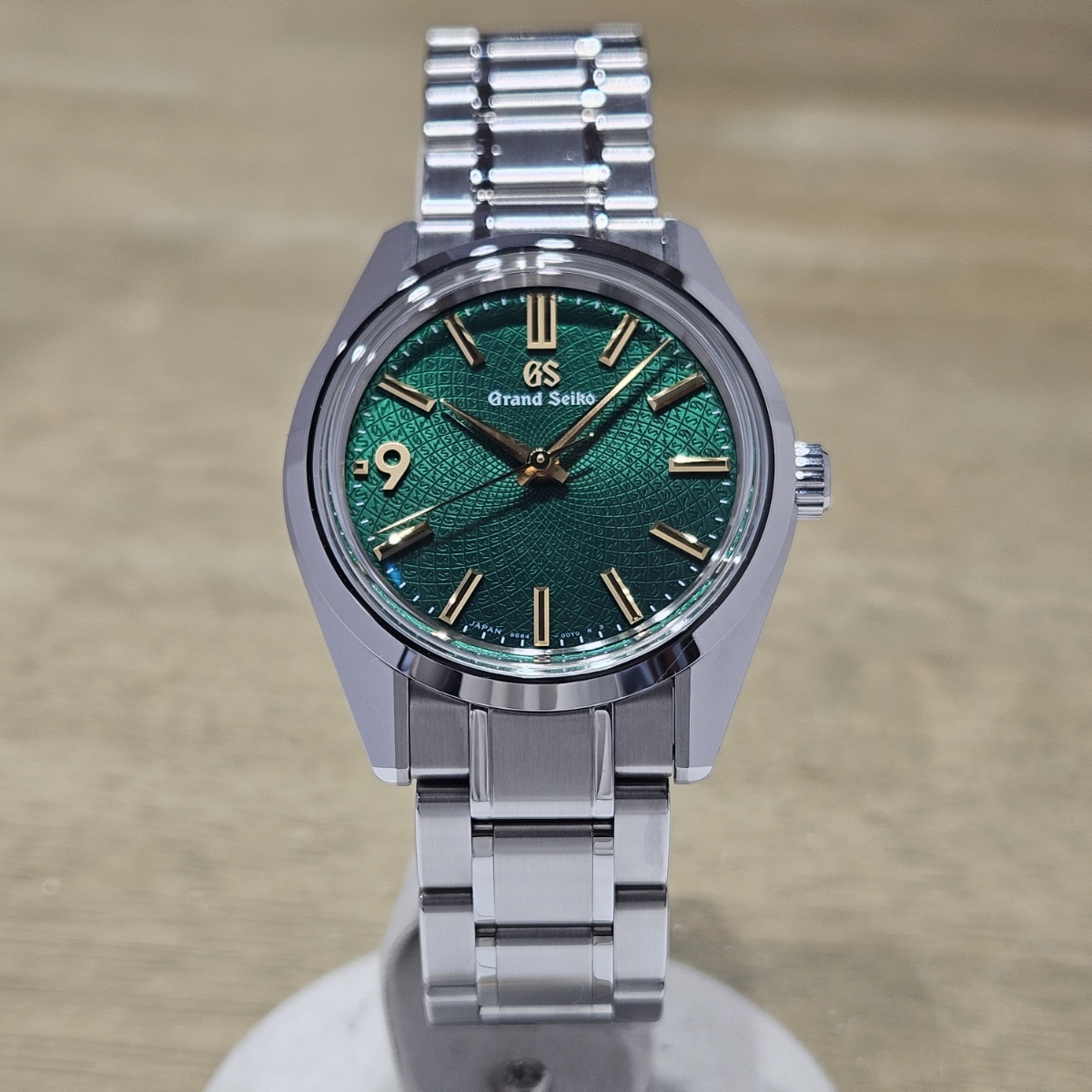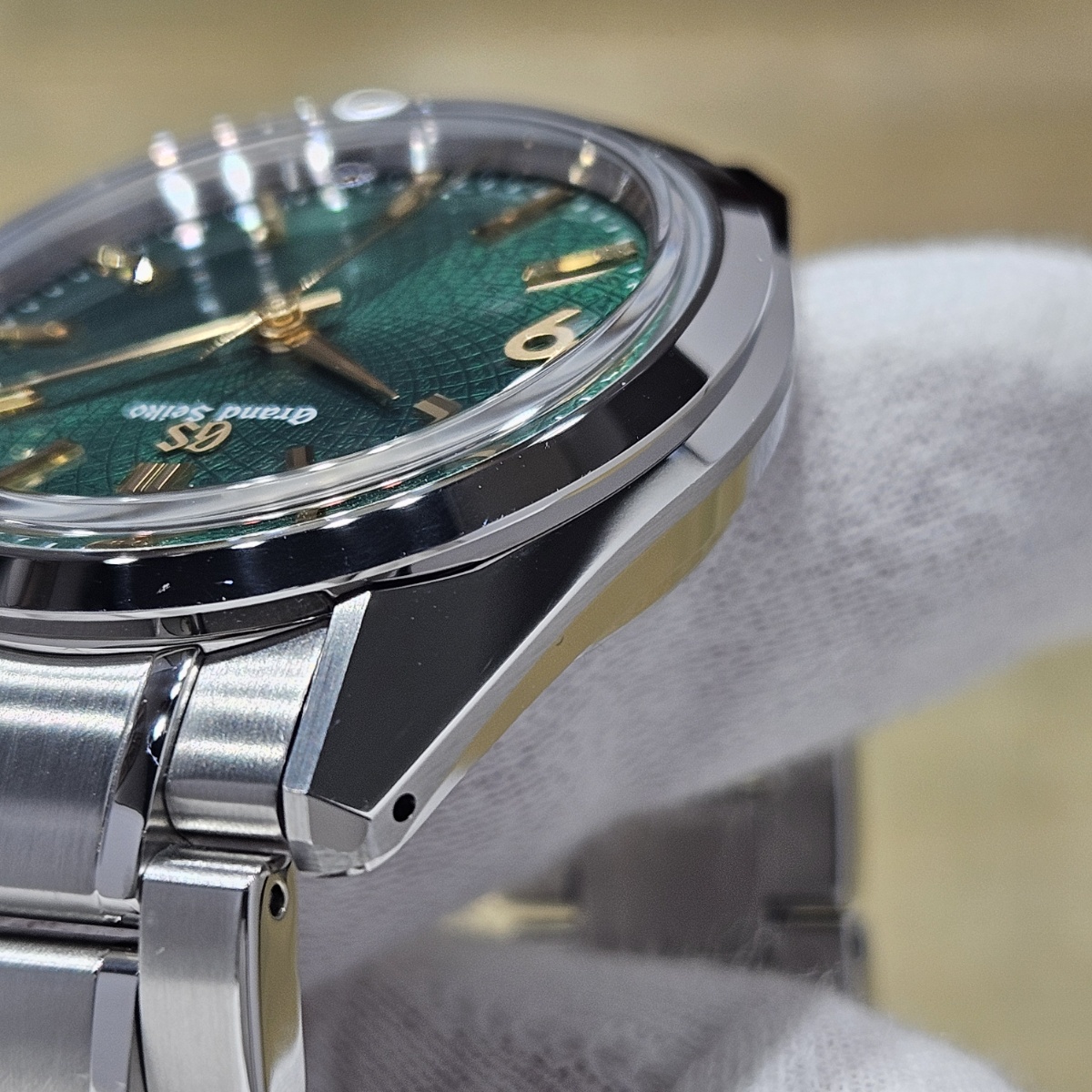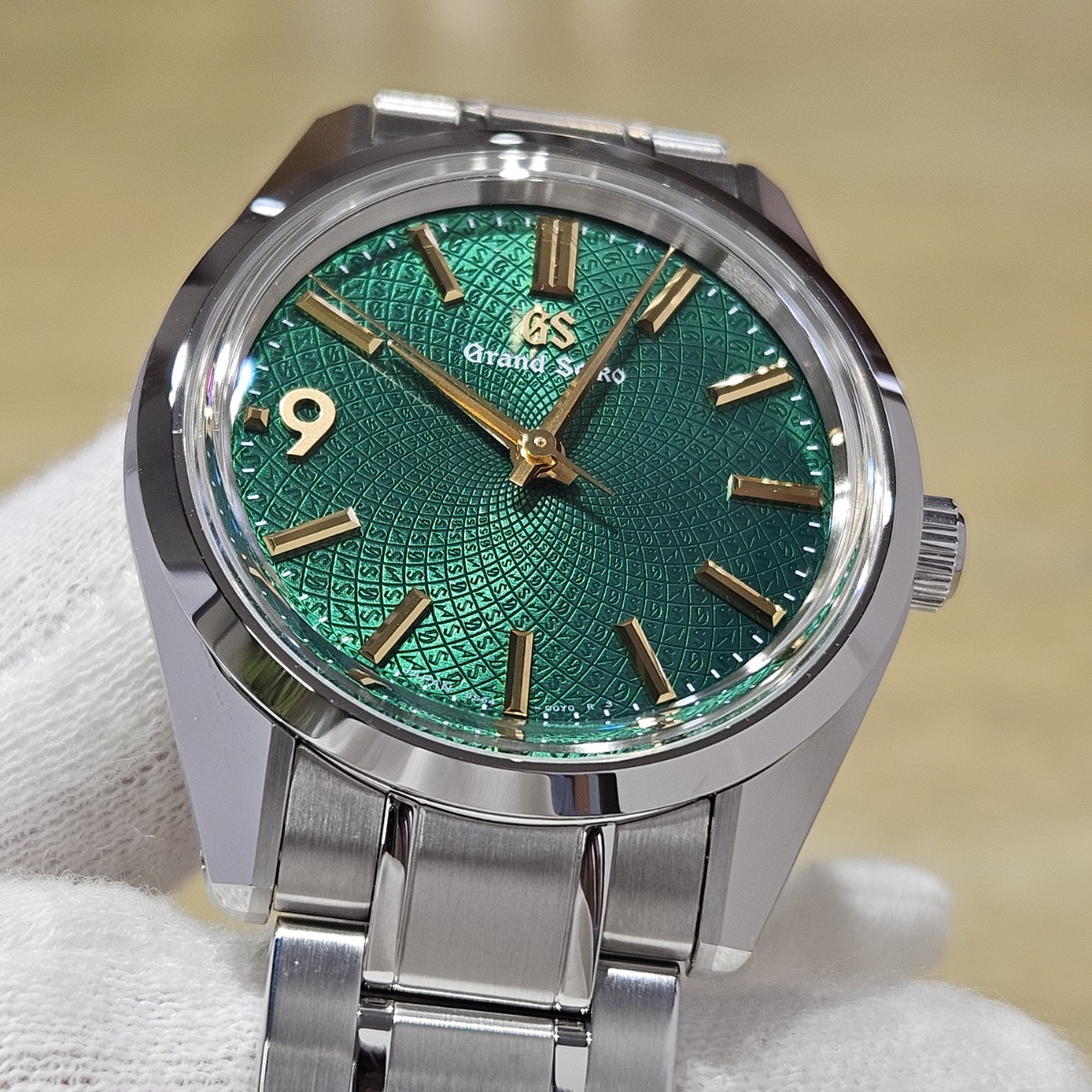 2024年9月。グランドセイコーのオーナーズクラブであるGS9clubの会員投票にてデザインが決定した150本限定の抽選購入が行われたモデルです。大きさが36.5mmというところもポイントでして大きすぎず日本人にぴったりのサイズ感となっております。マクロレンズで文字盤に寄ることで初めて分かるのがインデックスの仕上げ方法の違いです。バーインデックスは縦縞ギョーシェと鏡面仕上げになっておりますが、9の文字だけはサンドブラスト仕上げになっており9の文字だけが浮かびあがって見えます。文字盤もGとSの型打ち模様となっており一目で限定モデルと分かる仕様です。微細なスレのみの非常に綺麗なノンポリッシュ個体となりますので大人しいグランドセイコー以外に奇抜な1本をお探しの方は是非お問い合わせ下さい。 |