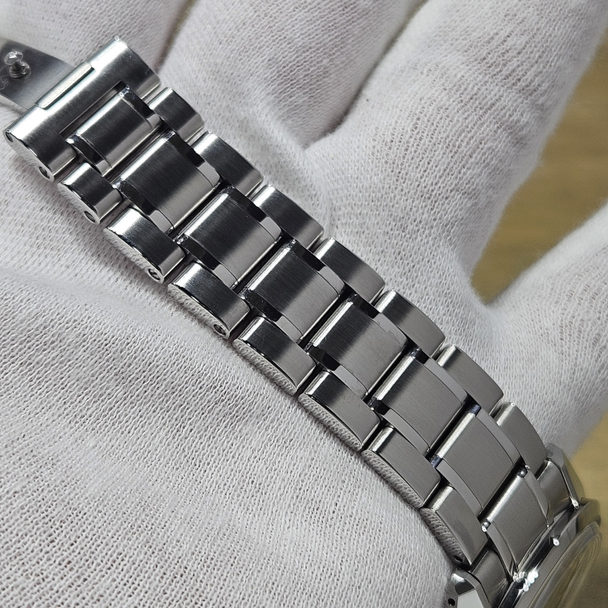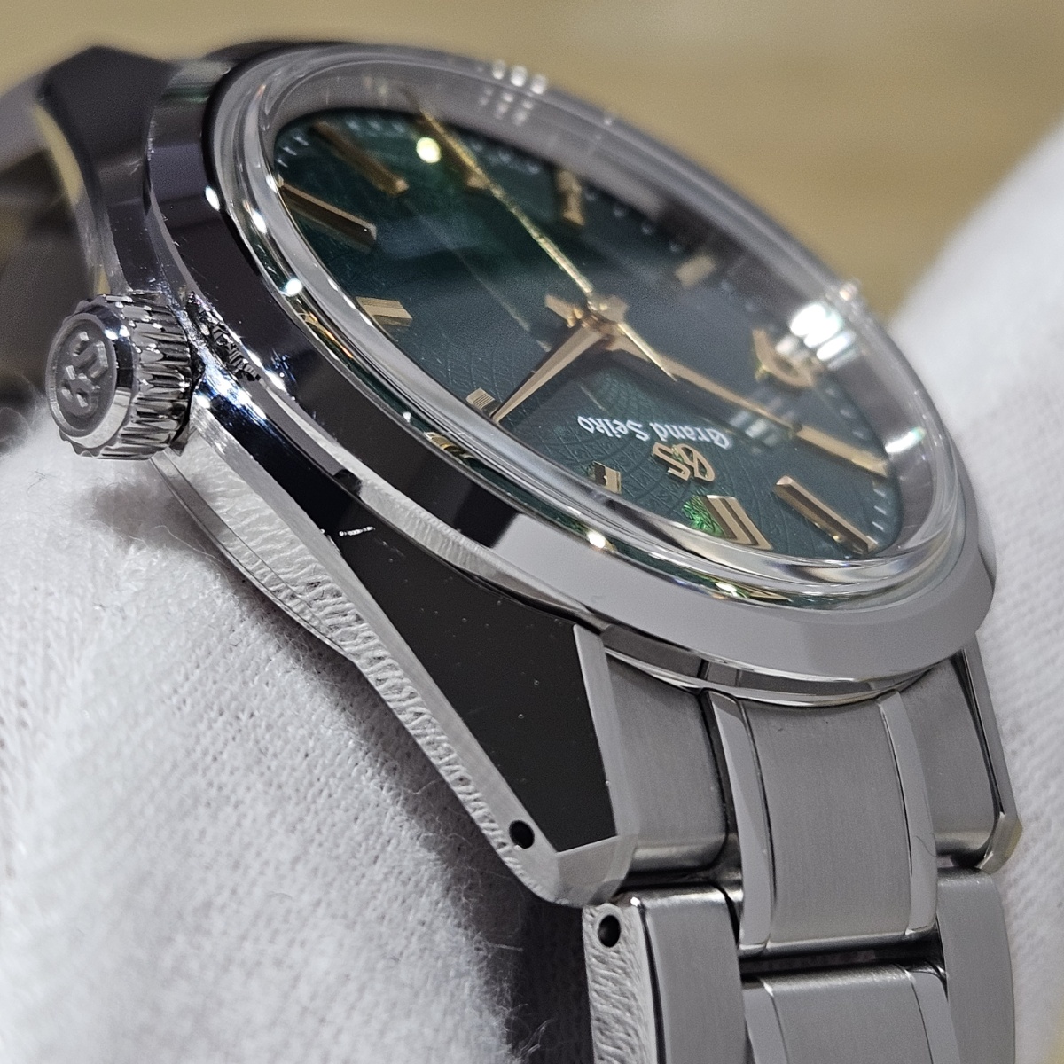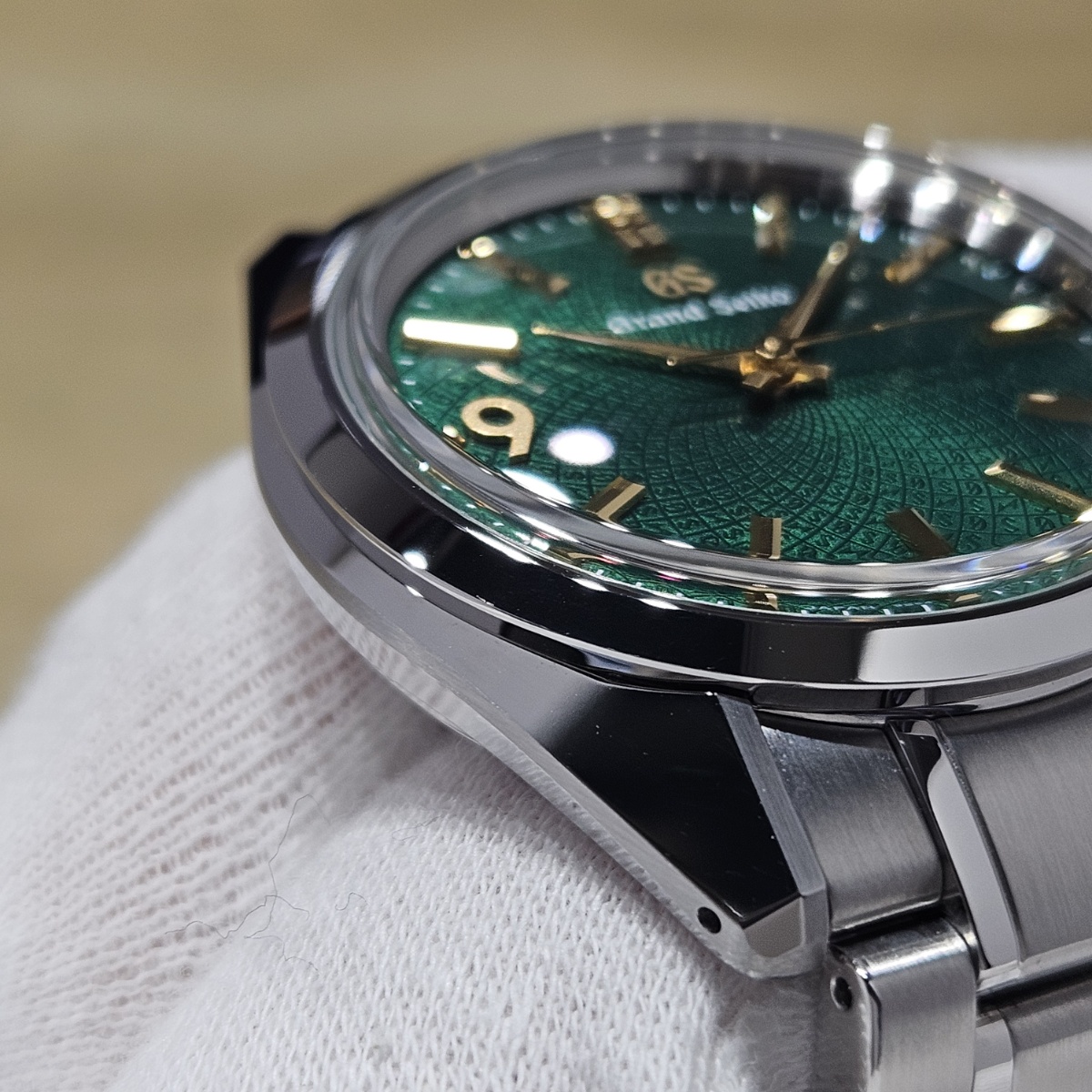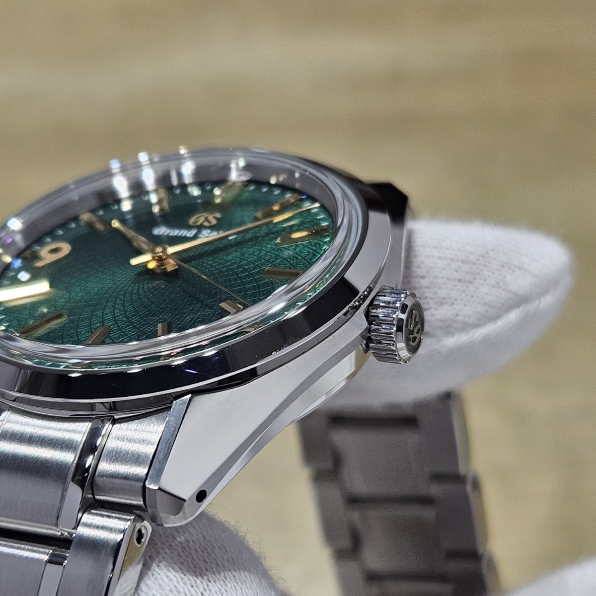2024年9月。グランドセイコーのオーナーズクラブであるGS9clubの会員投票にてデザインが決定した150本限定の抽選購入が行われたモデルです。大きさが36.5mmというところもポイントでして大きすぎず日本人にぴったりのサイズ感となっております。マクロレンズで文字盤に寄ることで初めて分かるのがインデックスの仕上げ方法の違いです。バーインデックスは縦縞ギョーシェと鏡面仕上げになっておりますが、9の文字だけはサンドブラスト仕上げになっており9の文字だけが浮かびあがって見えます。文字盤もGとSの型打ち模様となっており一目で限定モデルと分かる仕様です。微細なスレのみの非常に綺麗なノンポリッシュ個体となりますので大人しいグランドセイコー以外に奇抜な1本をお探しの方は是非お問い合わせ下さい。 |