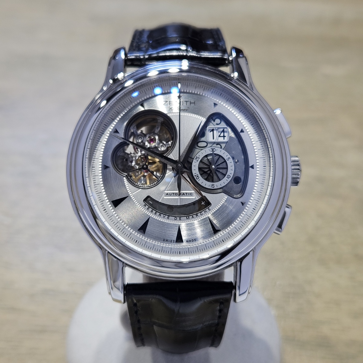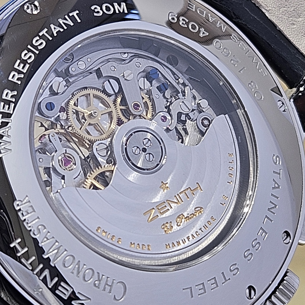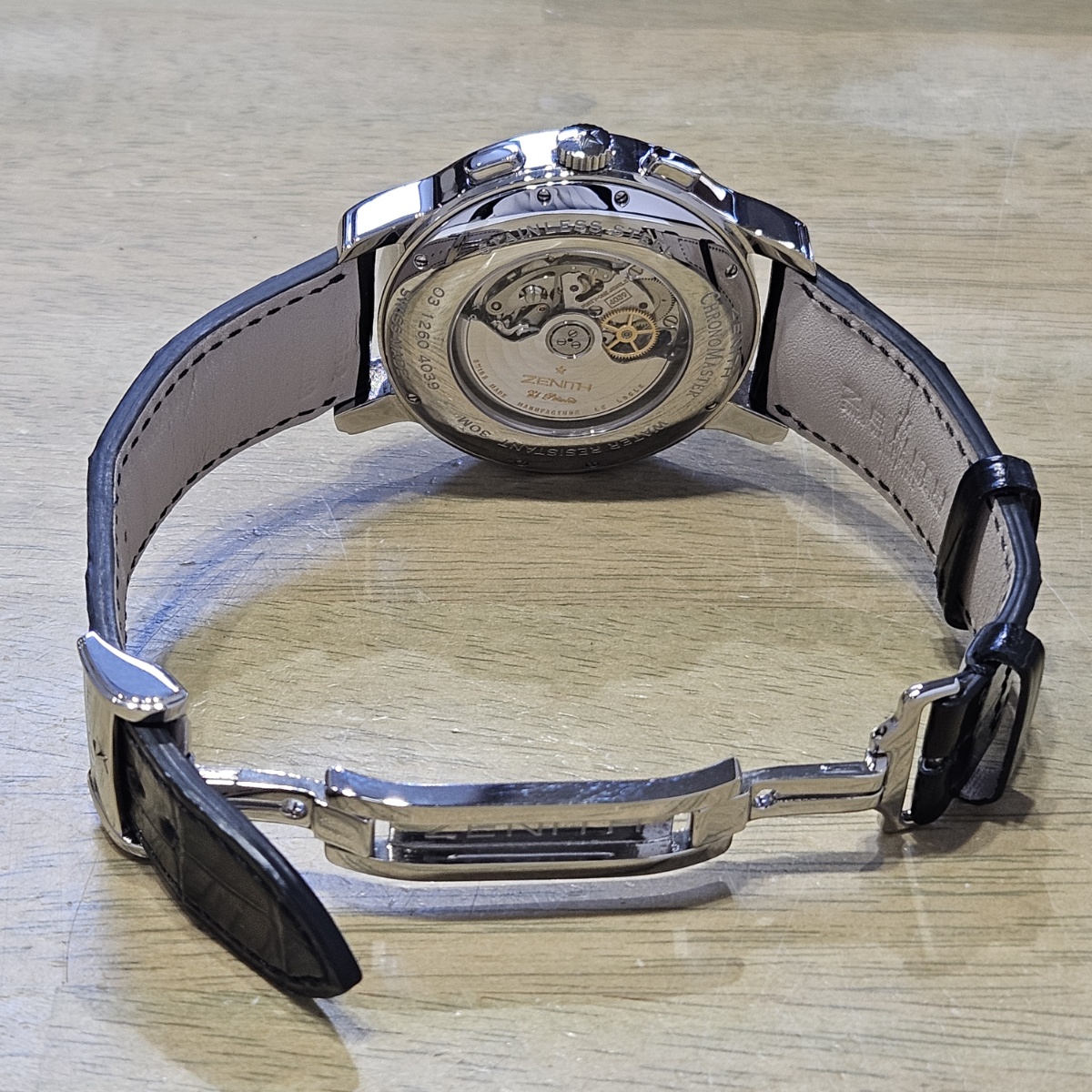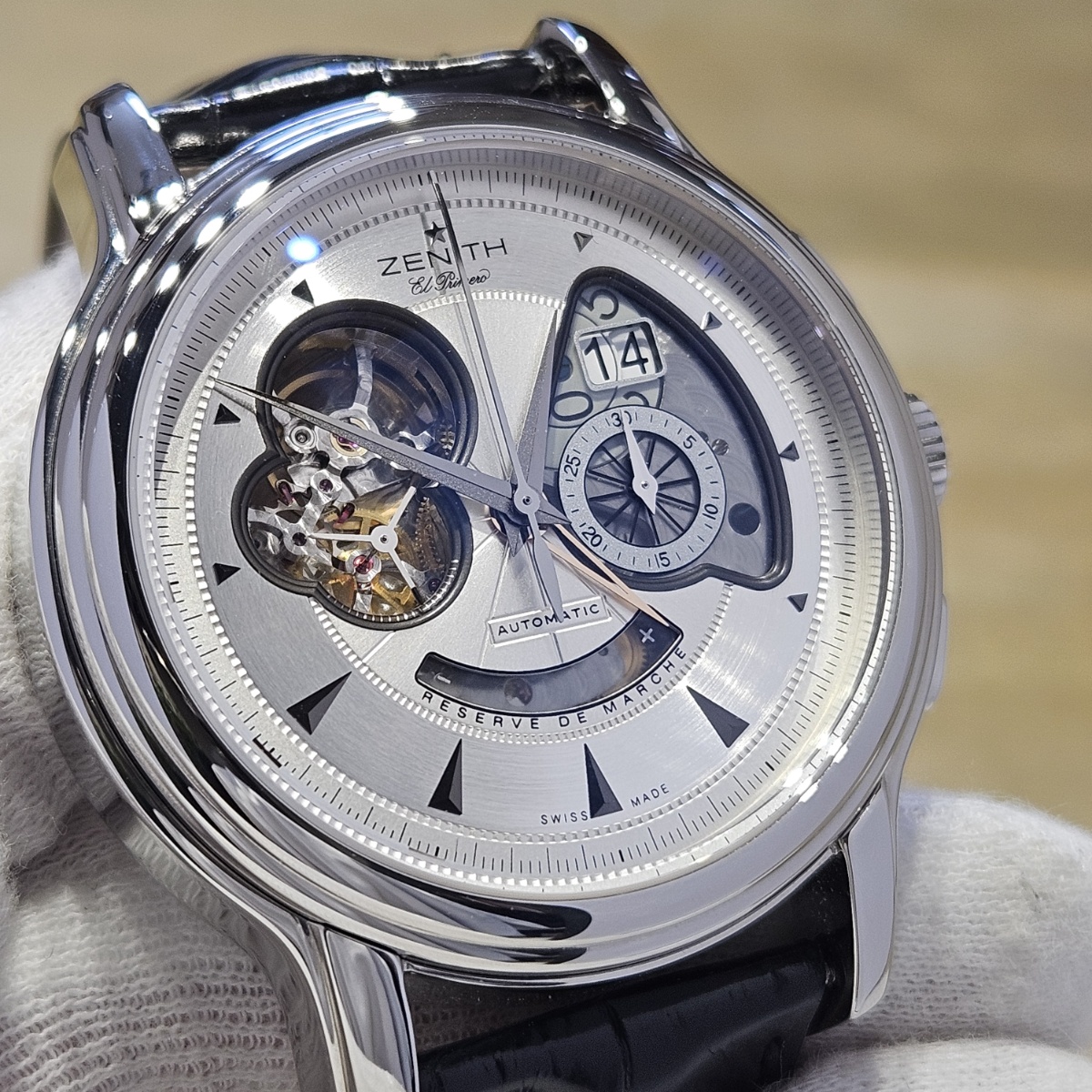 2010年5月印鑑、2024年5月にゼニスにて正規オーバーホール済のコンディション良好な1本となります。表からも裏からもゼニスの毎時36000振動のテンプ周りを見る事が出来ます。クロノグラフとパワーリザーブ、パノラマデイト表示機構を備えたcal.4039ムーブメントを搭載しておりエルプリメロの拡張性をいかんなく発揮した今発売したら定価いくらなんだろう、と思わせる1本です。45mmとスペックだけ見ると大振りですがベゼルとラグが薄くパネライのルミノール44mmより1周り小さいぐらいのイメージです。革ベルトもOH時にゼニス純正新品に交換されており使用感がほとんど無いものになります。とにかく文字盤デザインが凄まじく秀逸な1本ですので普通の時計ではつまらないという方は是非お問い合わせ下さい。 |