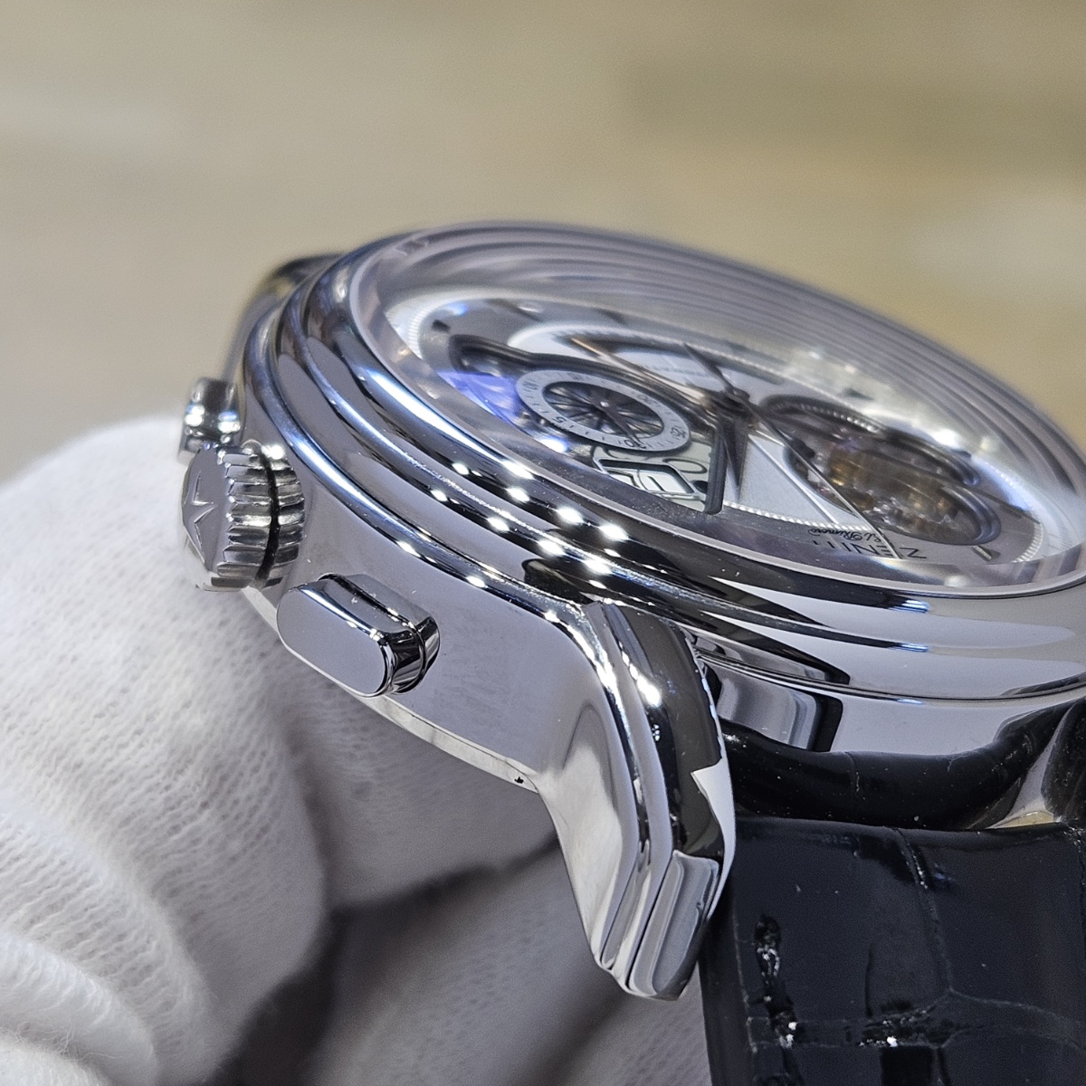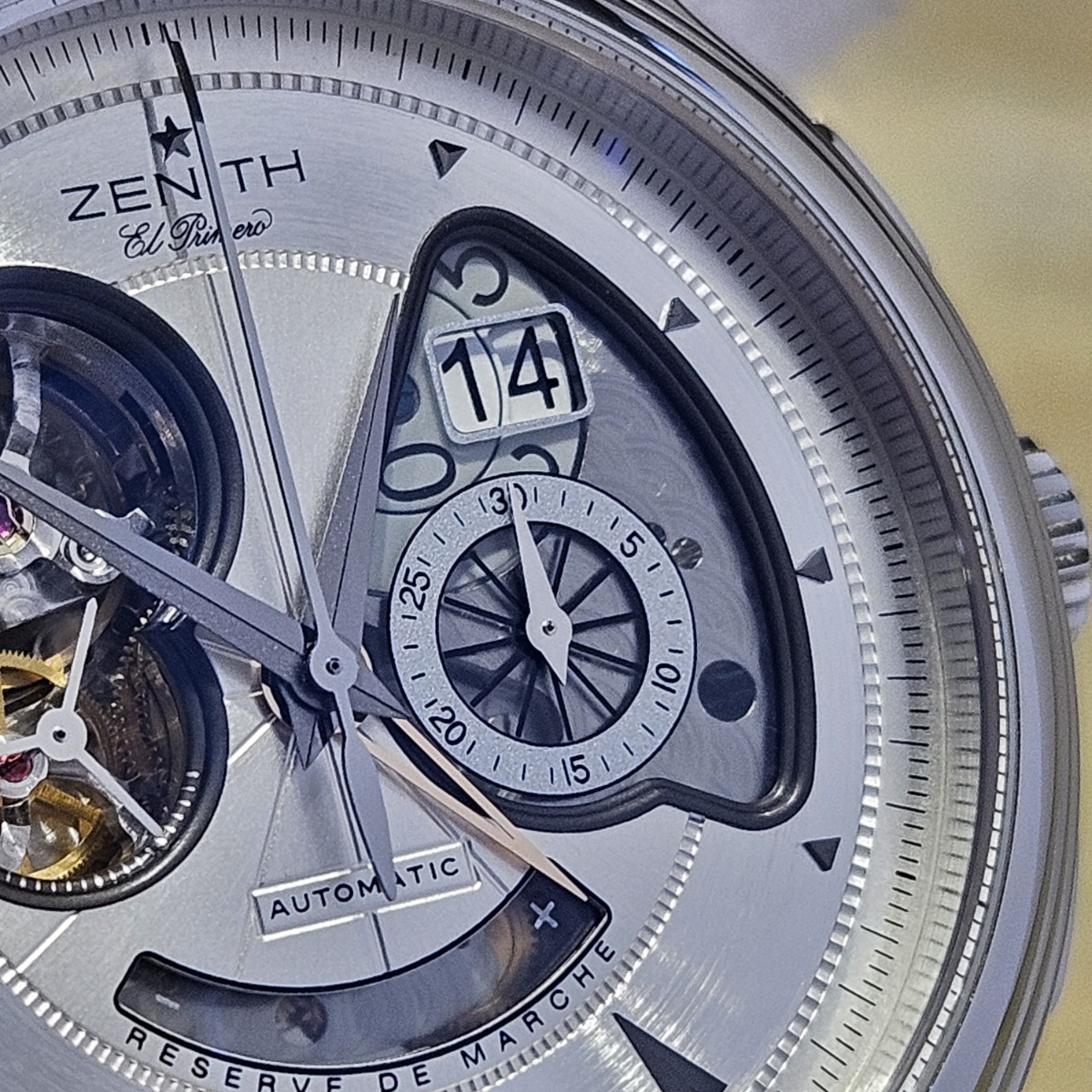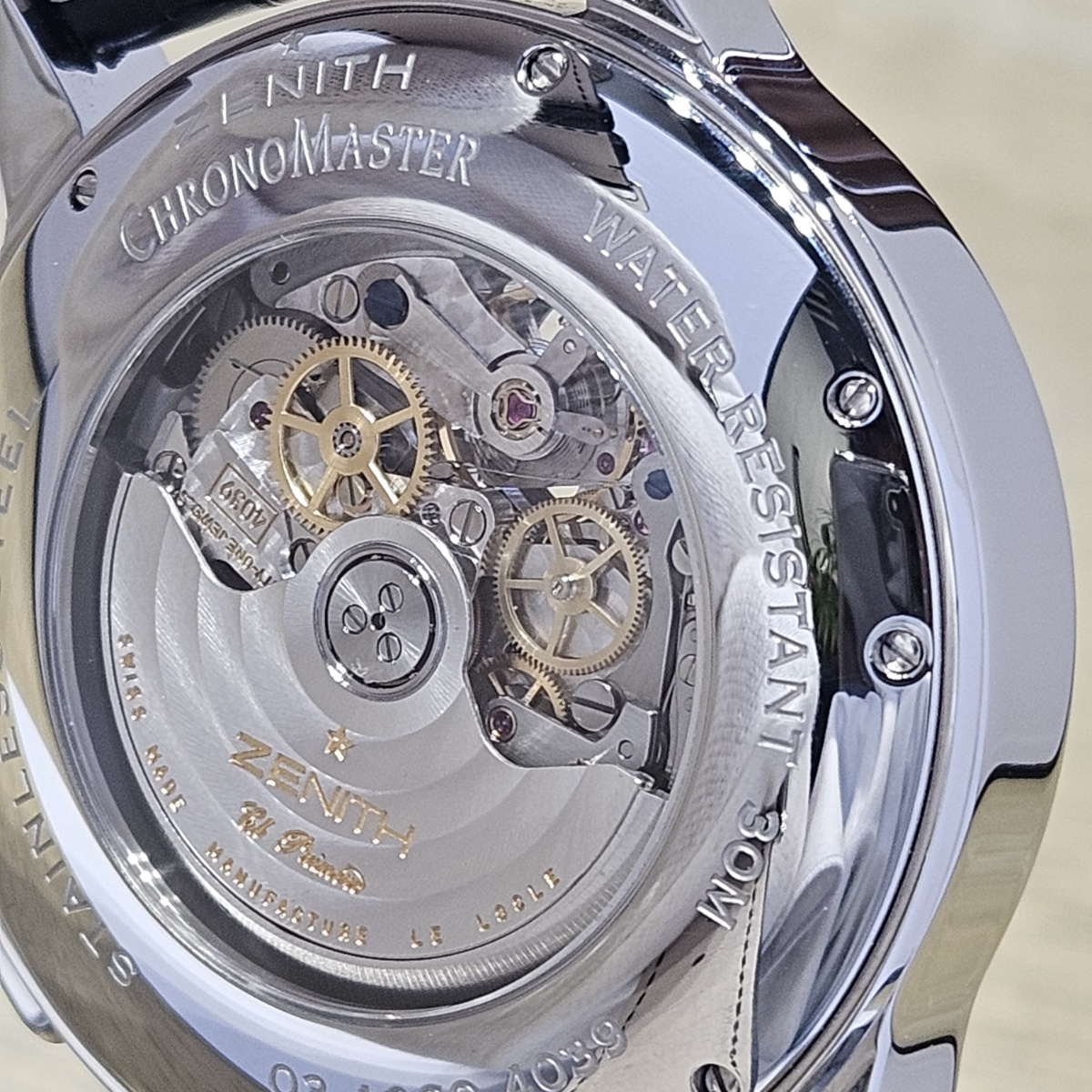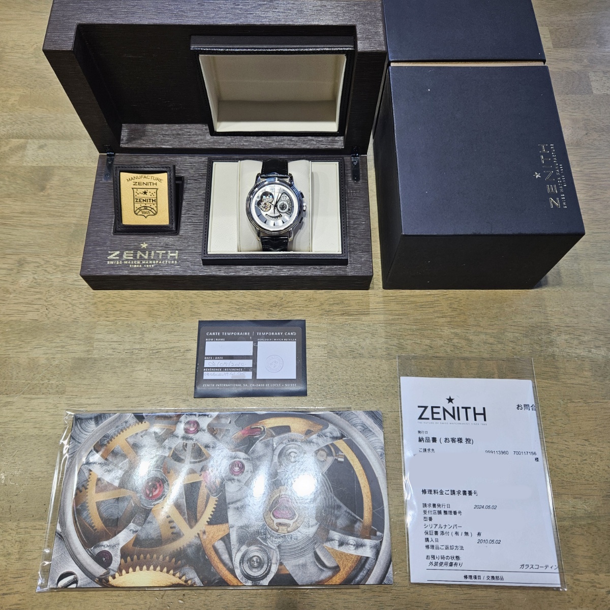 2010年5月印鑑、2024年5月にゼニスにて正規オーバーホール済のコンディション良好な1本となります。表からも裏からもゼニスの毎時36000振動のテンプ周りを見る事が出来ます。クロノグラフとパワーリザーブ、パノラマデイト表示機構を備えたcal.4039ムーブメントを搭載しておりエルプリメロの拡張性をいかんなく発揮した今発売したら定価いくらなんだろう、と思わせる1本です。45mmとスペックだけ見ると大振りですがベゼルとラグが薄くパネライのルミノール44mmより1周り小さいぐらいのイメージです。革ベルトもOH時にゼニス純正新品に交換されており使用感がほとんど無いものになります。とにかく文字盤デザインが凄まじく秀逸な1本ですので普通の時計ではつまらないという方は是非お問い合わせ下さい。 |