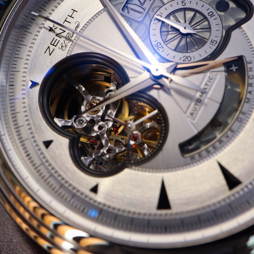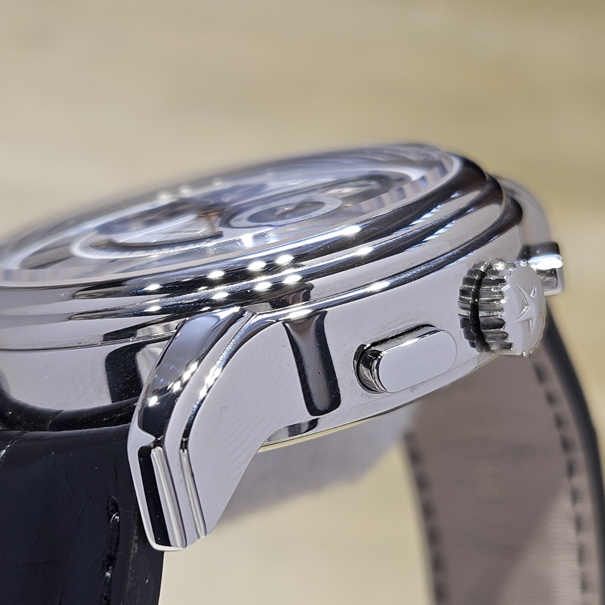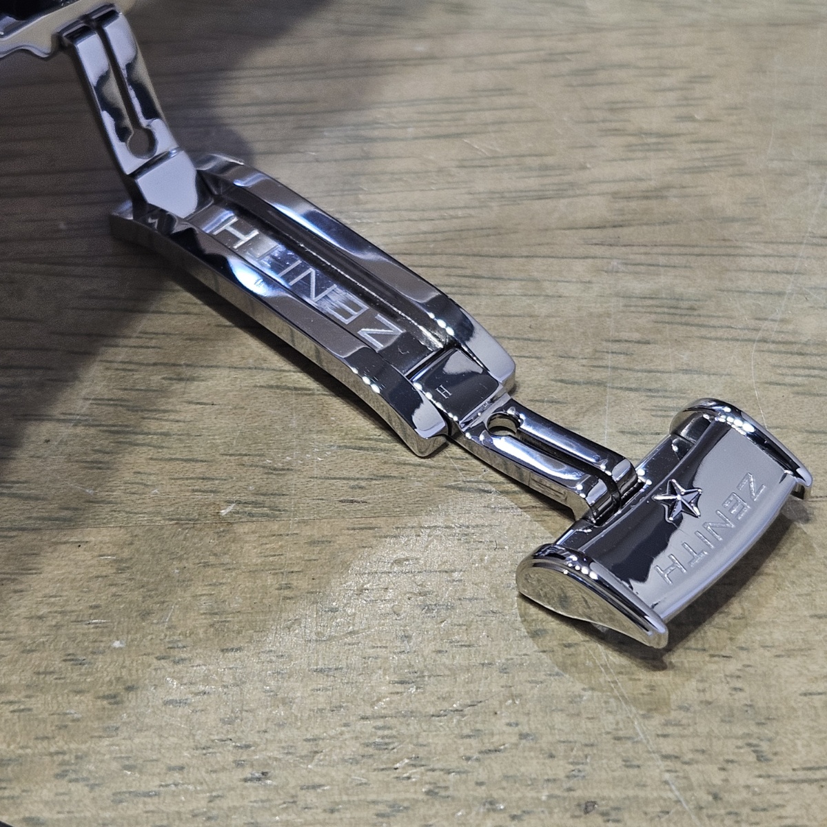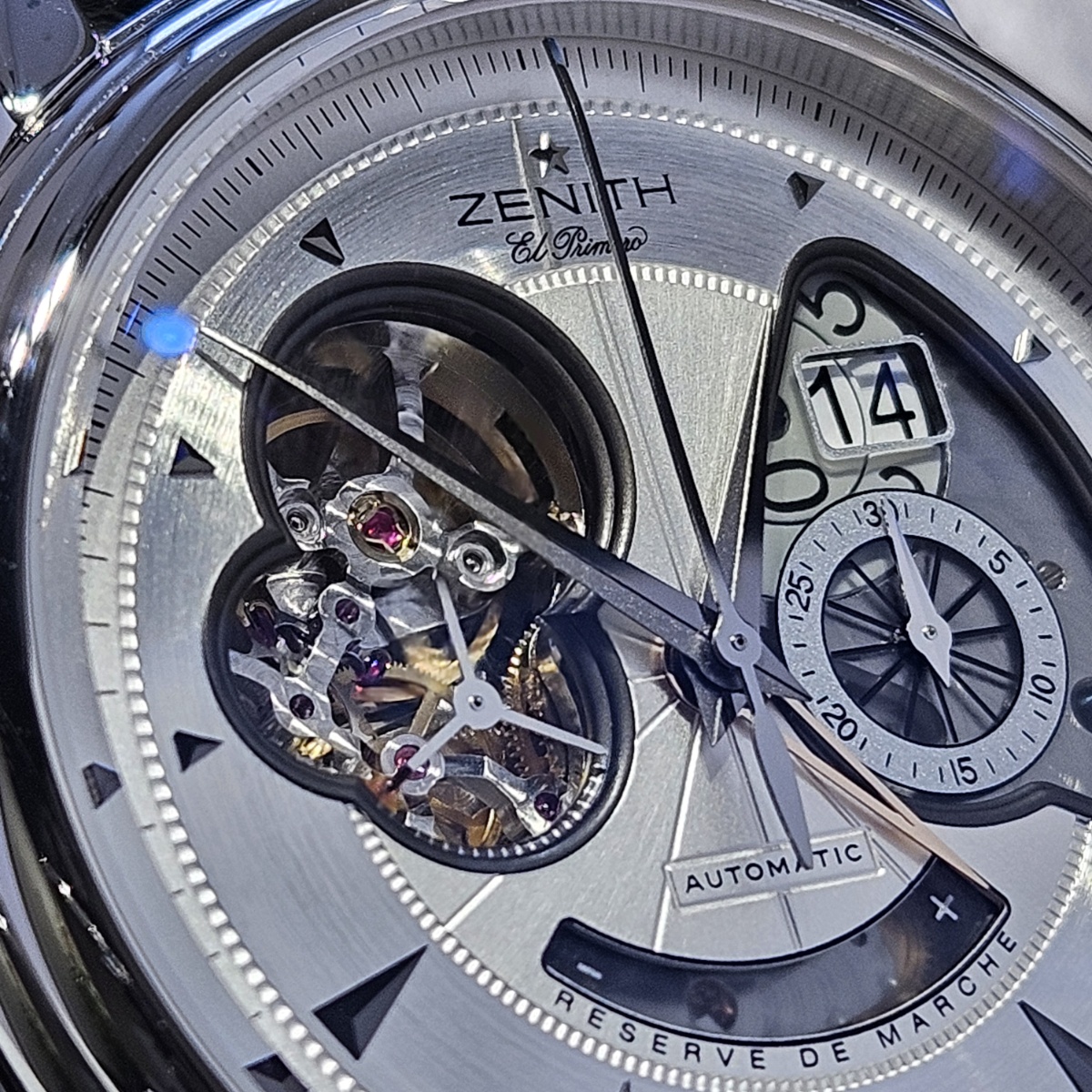 2010年5月印鑑、2024年5月にゼニスにて正規オーバーホール済のコンディション良好な1本となります。表からも裏からもゼニスの毎時36000振動のテンプ周りを見る事が出来ます。クロノグラフとパワーリザーブ、パノラマデイト表示機構を備えたcal.4039ムーブメントを搭載しておりエルプリメロの拡張性をいかんなく発揮した今発売したら定価いくらなんだろう、と思わせる1本です。45mmとスペックだけ見ると大振りですがベゼルとラグが薄くパネライのルミノール44mmより1周り小さいぐらいのイメージです。革ベルトもOH時にゼニス純正新品に交換されており使用感がほとんど無いものになります。とにかく文字盤デザインが凄まじく秀逸な1本ですので普通の時計ではつまらないという方は是非お問い合わせ下さい。 |