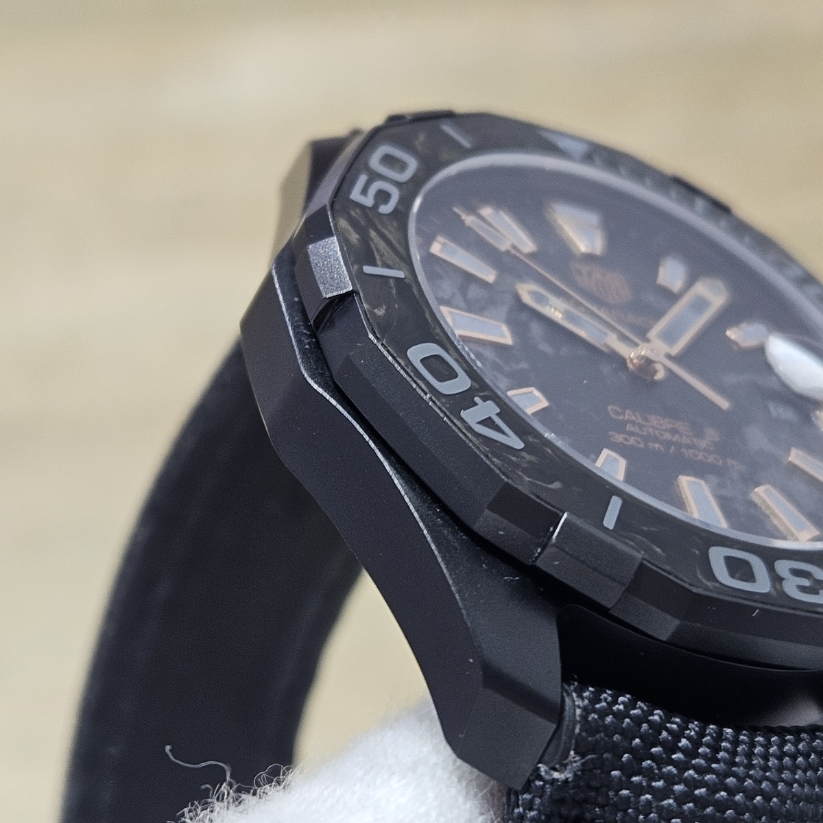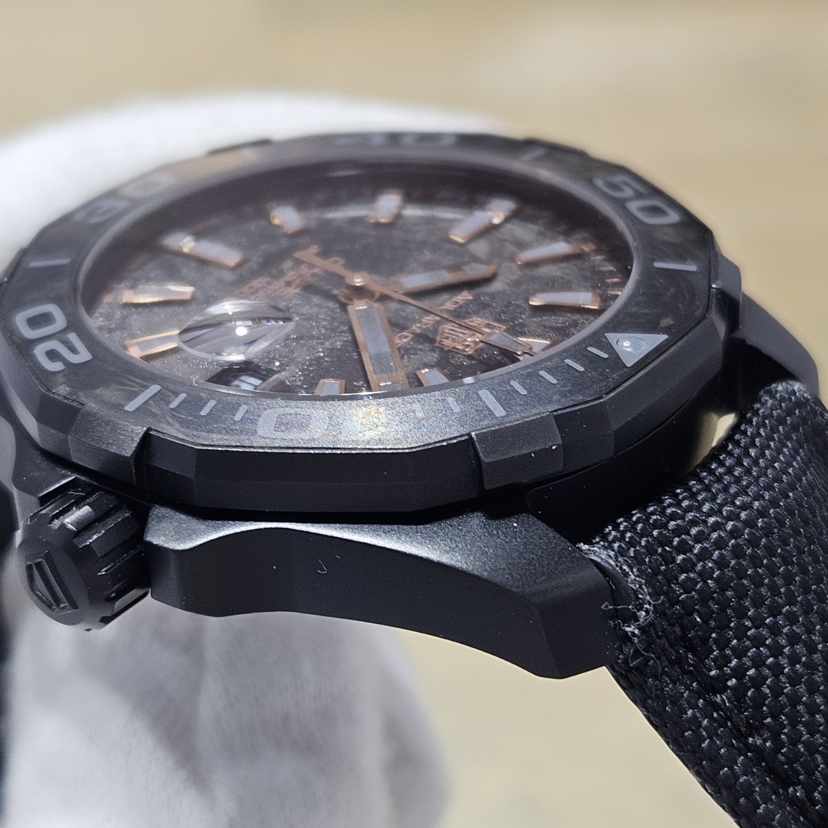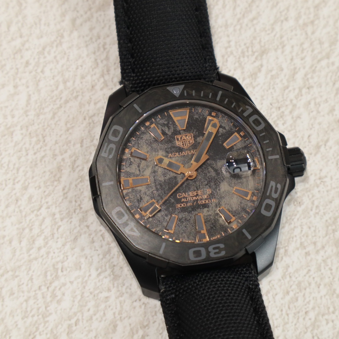 | コメント | 2024年4月。カーボン文字盤のアクアレーサーの入荷です。ケースもカーボンにPVDコーティングをしたものですのでベルトとバックルを含めても83gという41mmケースながら超軽量モデルとなります。文字盤のカーボンとベゼルのカーボン模様が組み合わさり独特の雰囲気を醸しております。ベルトは表面はファブリック、内側はラバー素材となっておりまして汗を気にせずにお使い頂ける仕様になっております。実用ダイバーズウォッチをお探しの方は是非お問い合わせ下さい。 |