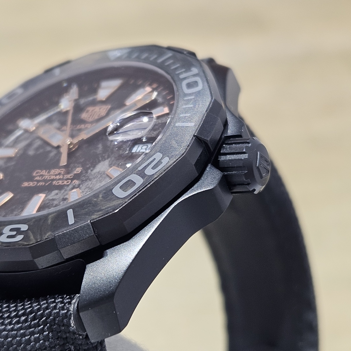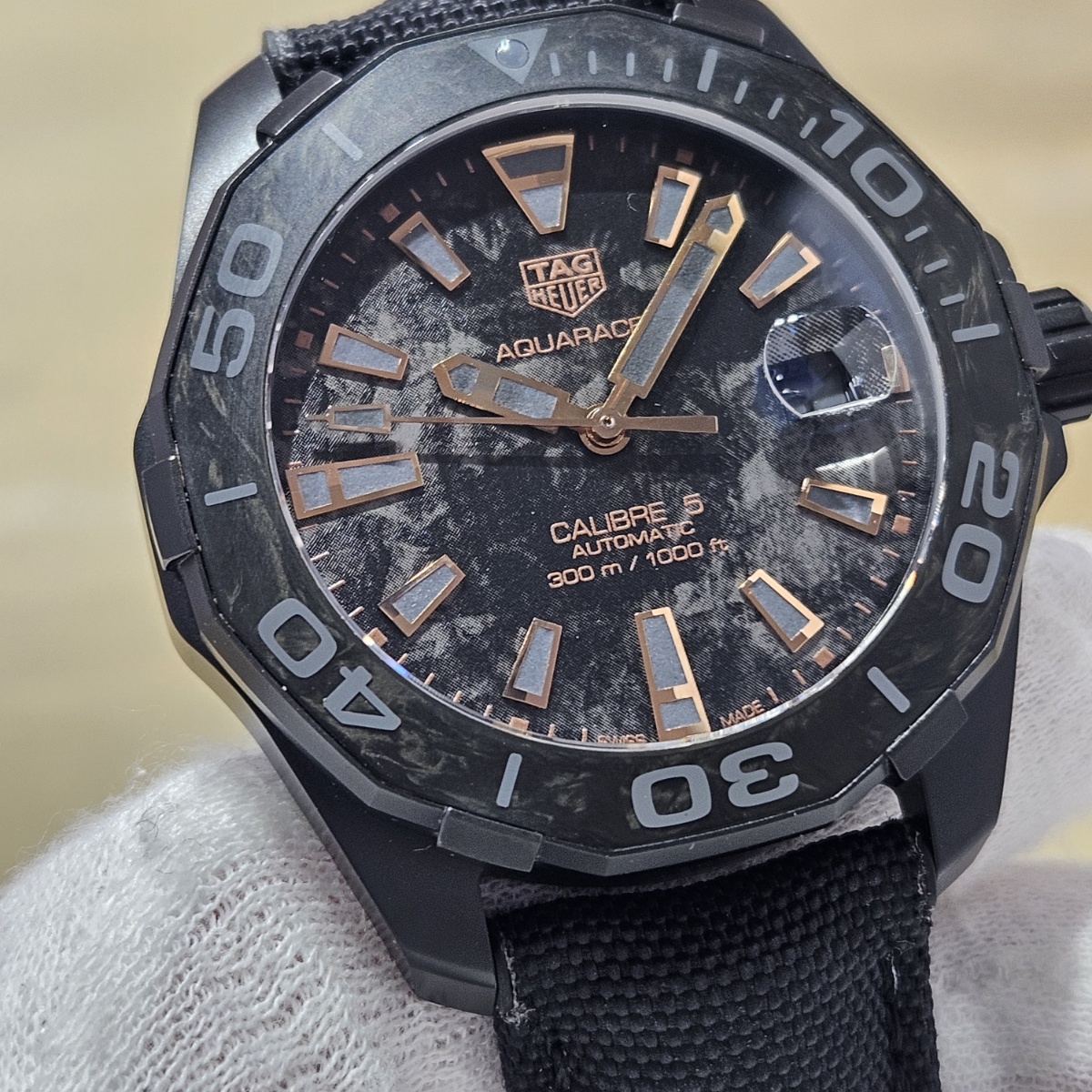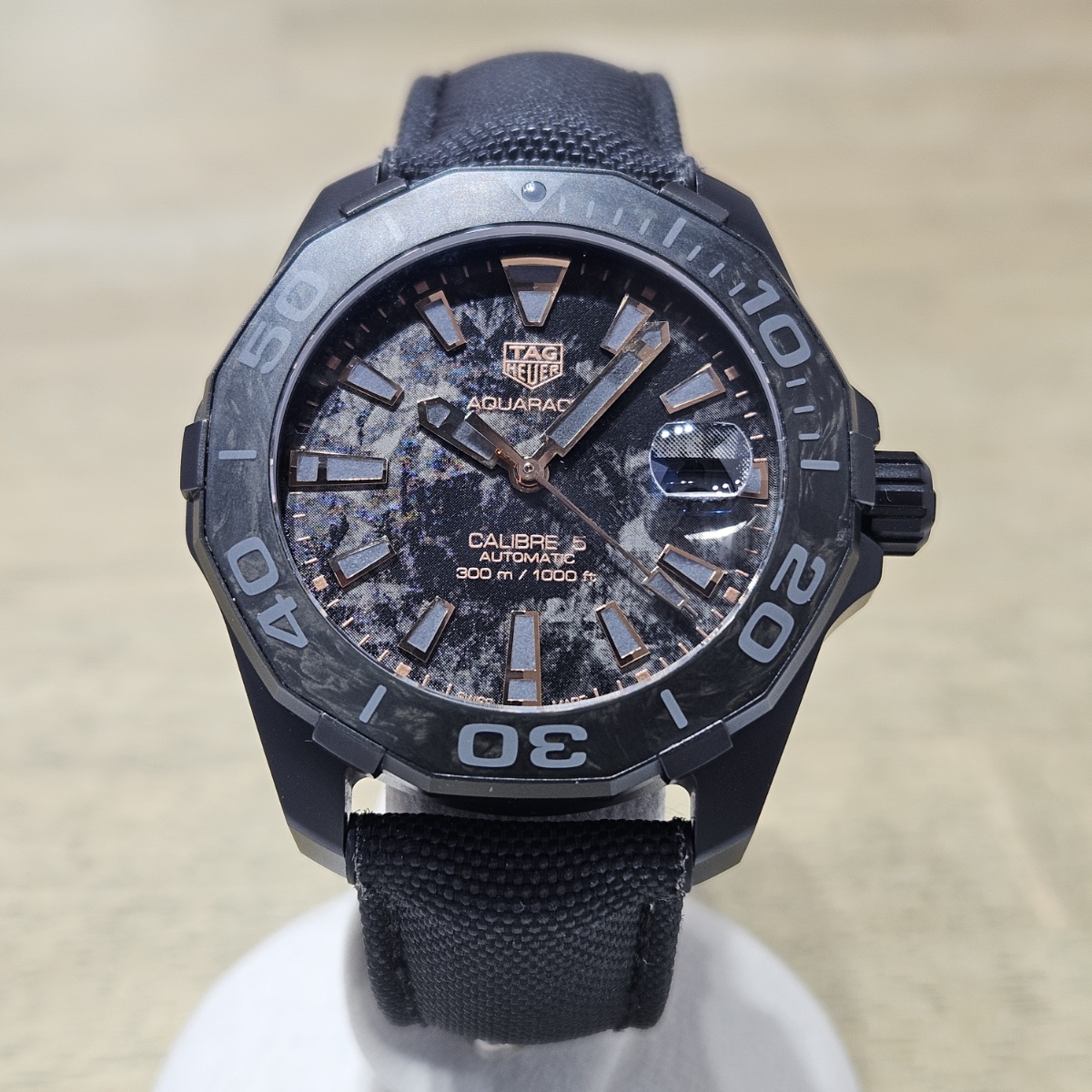 | コメント | 2024年4月。カーボン文字盤のアクアレーサーの入荷です。ケースもカーボンにPVDコーティングをしたものですのでベルトとバックルを含めても83gという41mmケースながら超軽量モデルとなります。文字盤のカーボンとベゼルのカーボン模様が組み合わさり独特の雰囲気を醸しております。ベルトは表面はファブリック、内側はラバー素材となっておりまして汗を気にせずにお使い頂ける仕様になっております。実用ダイバーズウォッチをお探しの方は是非お問い合わせ下さい。 |