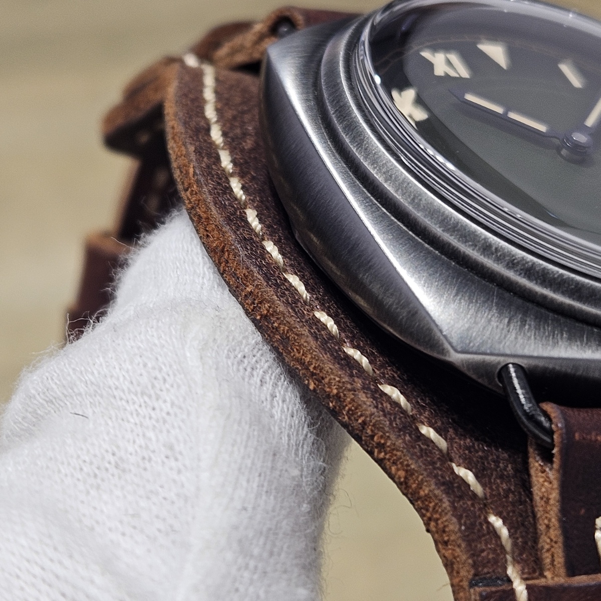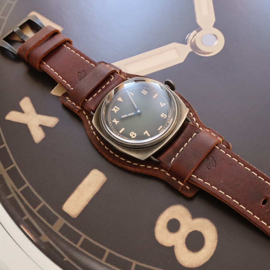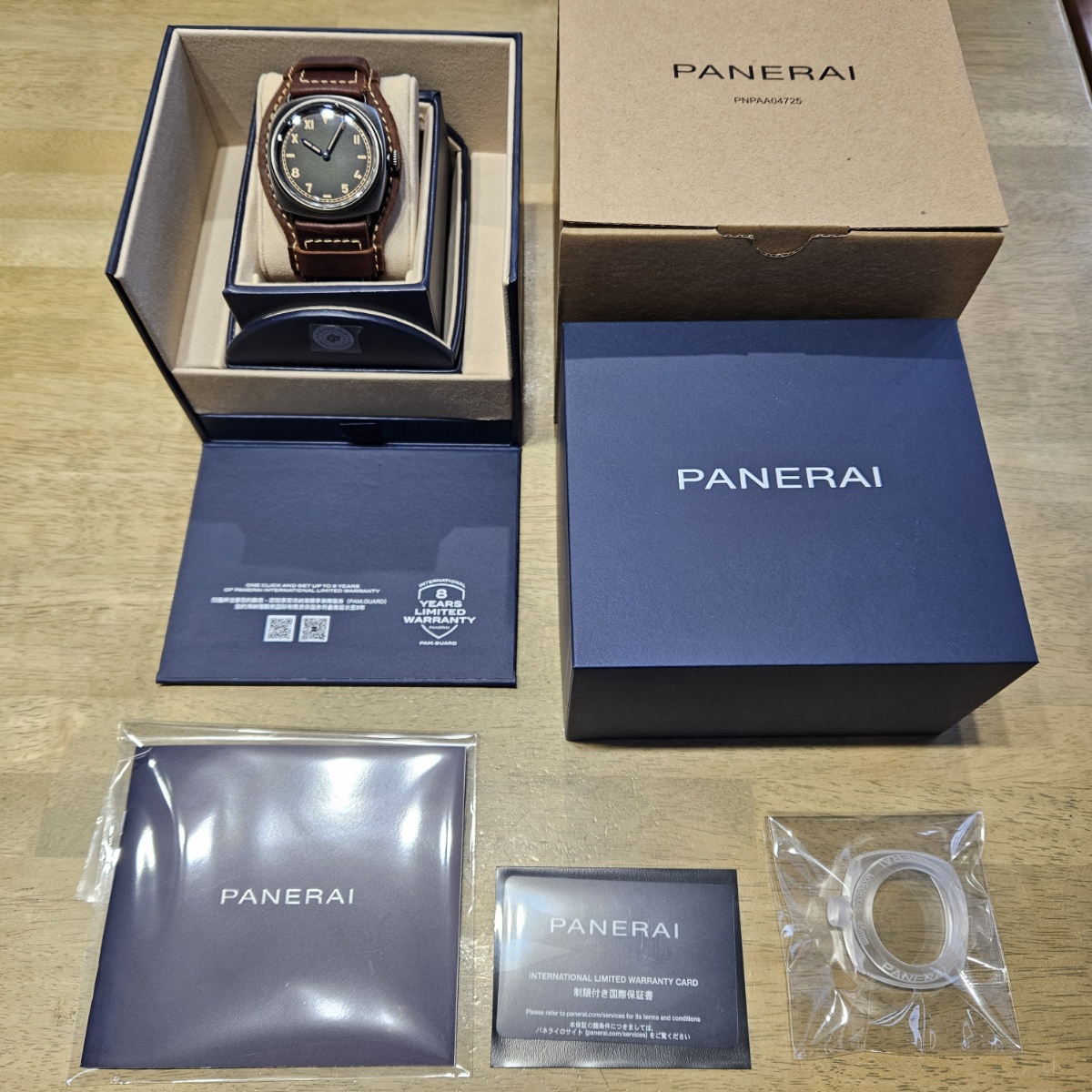 | コメント | 2025年1月。前オーナー様が購入されたパネライ純正のプロテクターカバーが付属する限定ラジオミールの入荷です。プロテクターは取り外し可能となっておりますので通常のベルトとクラシックな雰囲気で使い分けが可能でございます。文字盤のグリーンのグラデーションとヴィンテージレザーのカラー相性が良い1本です。2025年購入のノンポリッシュの極上品となりますのでお探しの方は是非お問い合わせ下さい。 |