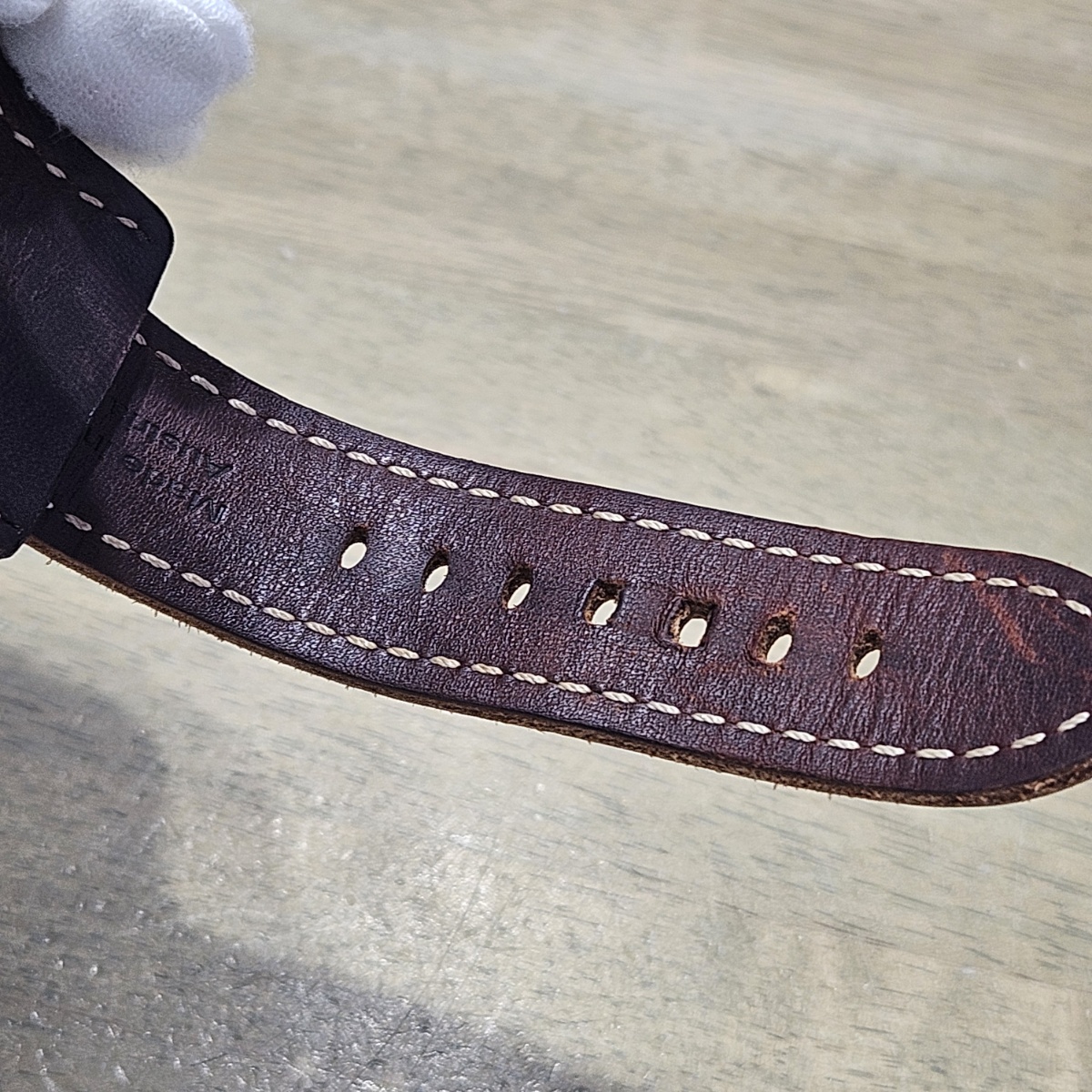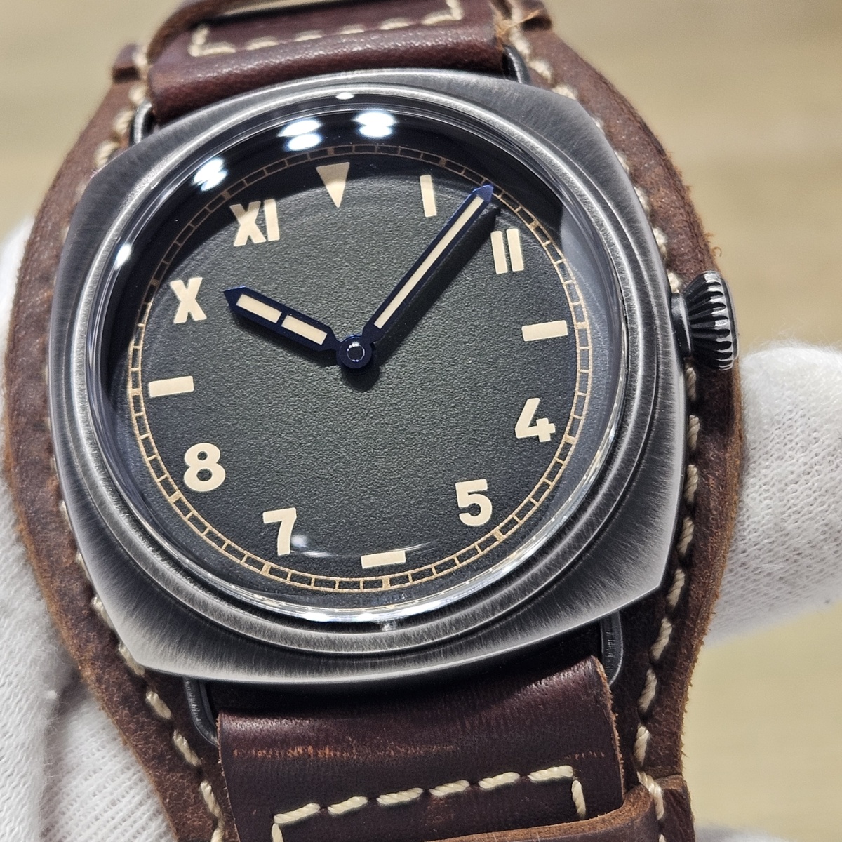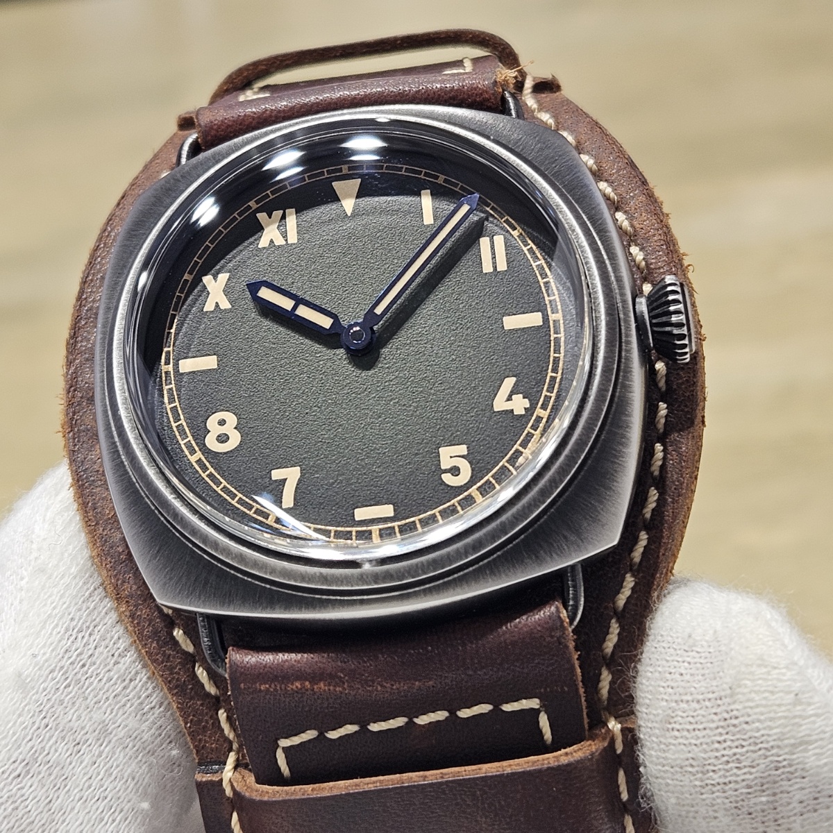 | コメント | 2025年1月。前オーナー様が購入されたパネライ純正のプロテクターカバーが付属する限定ラジオミールの入荷です。プロテクターは取り外し可能となっておりますので通常のベルトとクラシックな雰囲気で使い分けが可能でございます。文字盤のグリーンのグラデーションとヴィンテージレザーのカラー相性が良い1本です。2025年購入のノンポリッシュの極上品となりますのでお探しの方は是非お問い合わせ下さい。 |