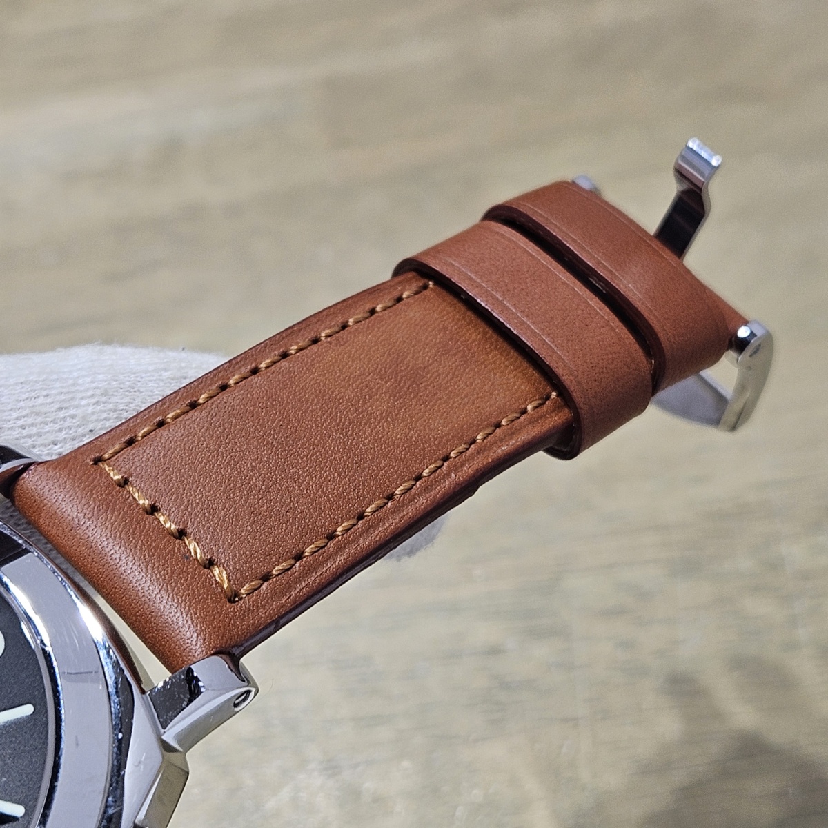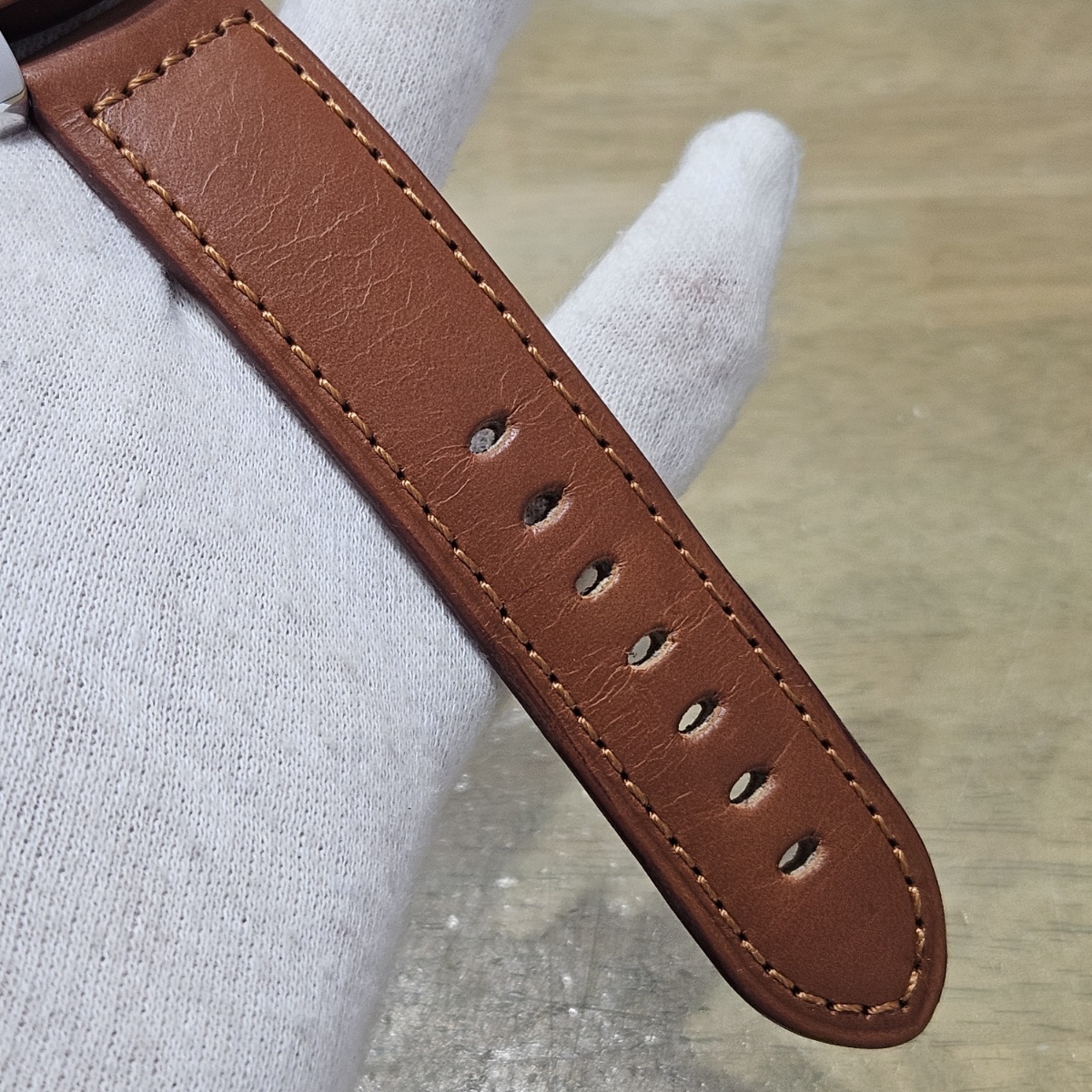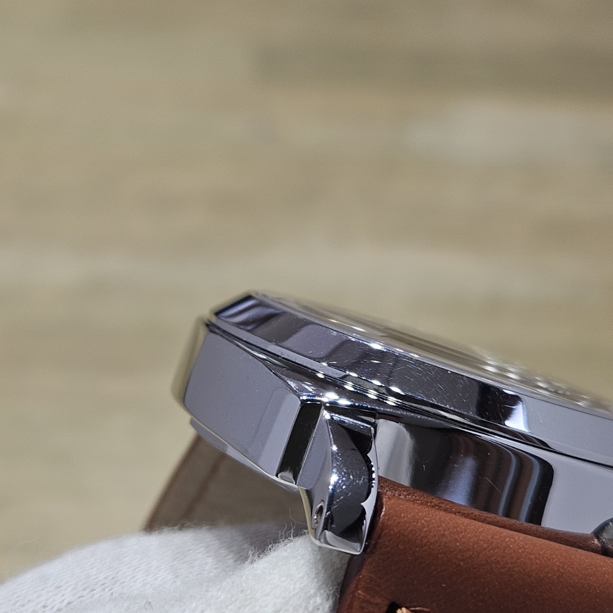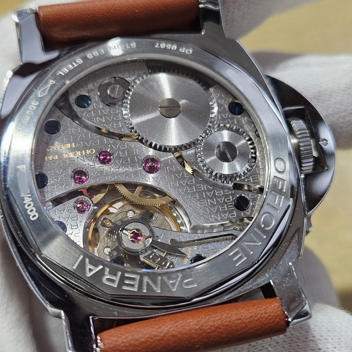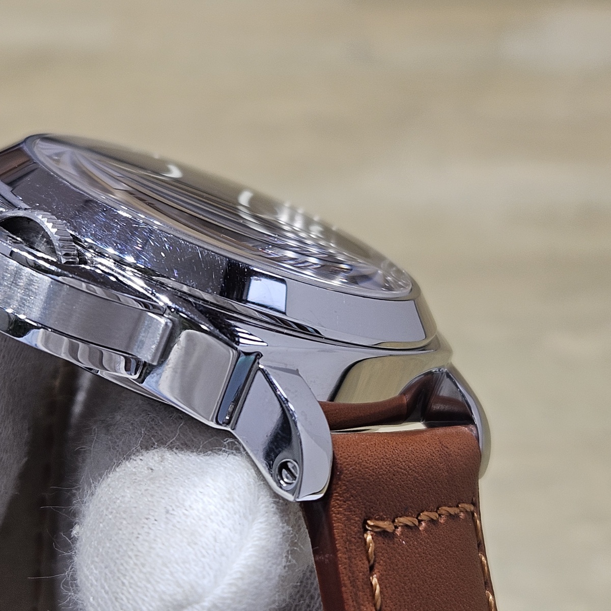 | コメント | 2003年11月。初期型の流し込みダイアル&鏡面リューズガードのPAM00111の入荷です。通常はサンドイッチ文字盤になるPAM00111ですが今回は初期型の為正面から見た印象はPAM00001とそっくりです。ですが型番がPAM00111になっている為裏スケルトン仕様になっております。ムーヴメントも後期のコートドジュネーブ仕上げでは無くムーブメント全体にパネライ刻印の入るモノグラム仕上げになっております。PAM00111も初期の個体のみモノグラム仕上げになっておりますのでこの年代が好きな方がいるピンポイントなPAM00111の個体になっております。精度も+1秒と抜群ですので流し込みダイアルのPAM00111をお探しの方は是非お問い合わせ下さい。 |