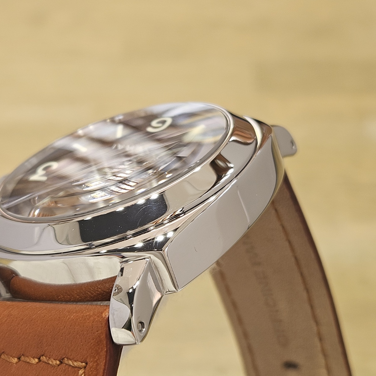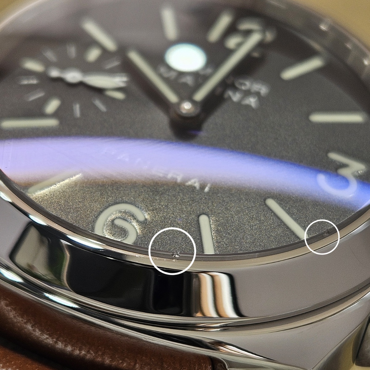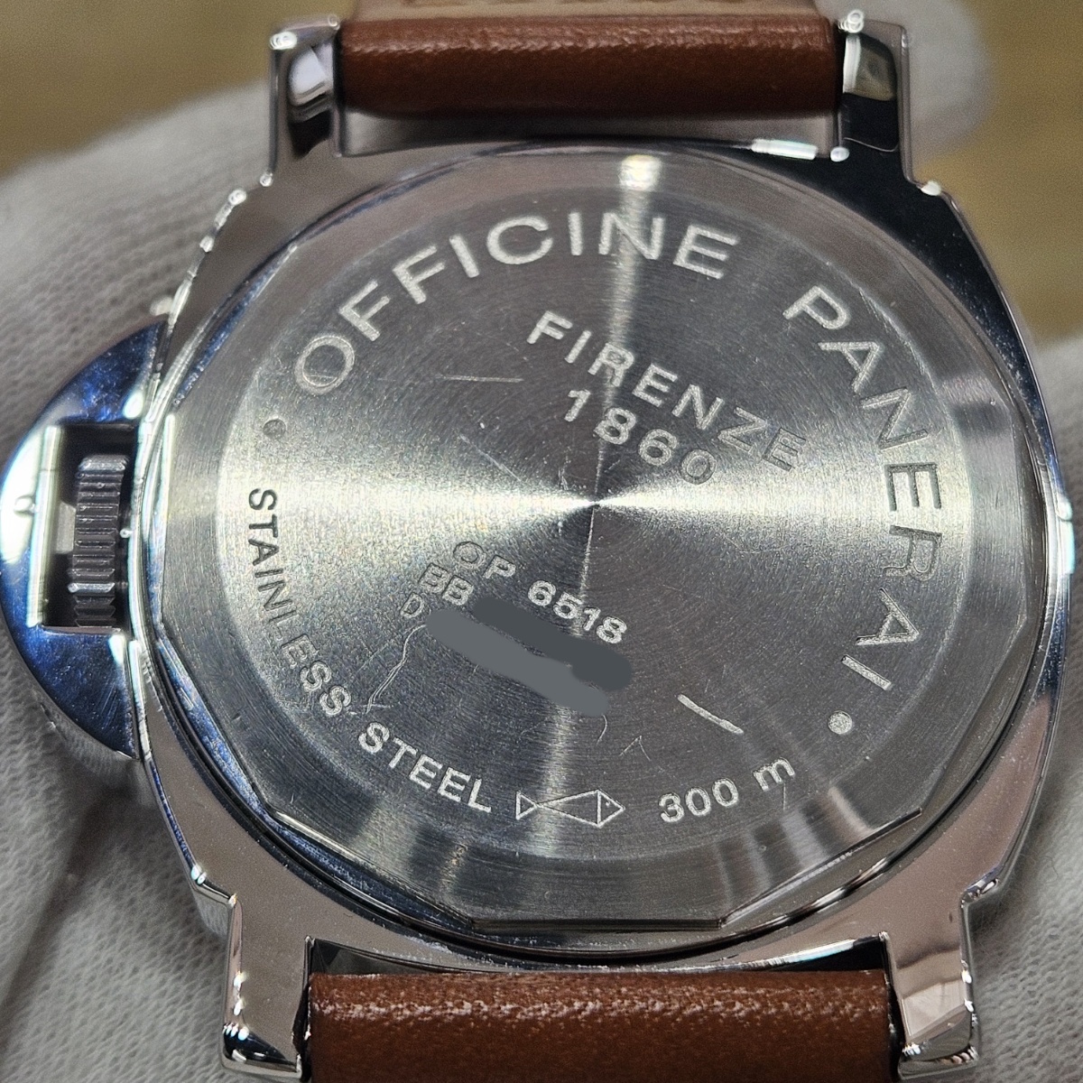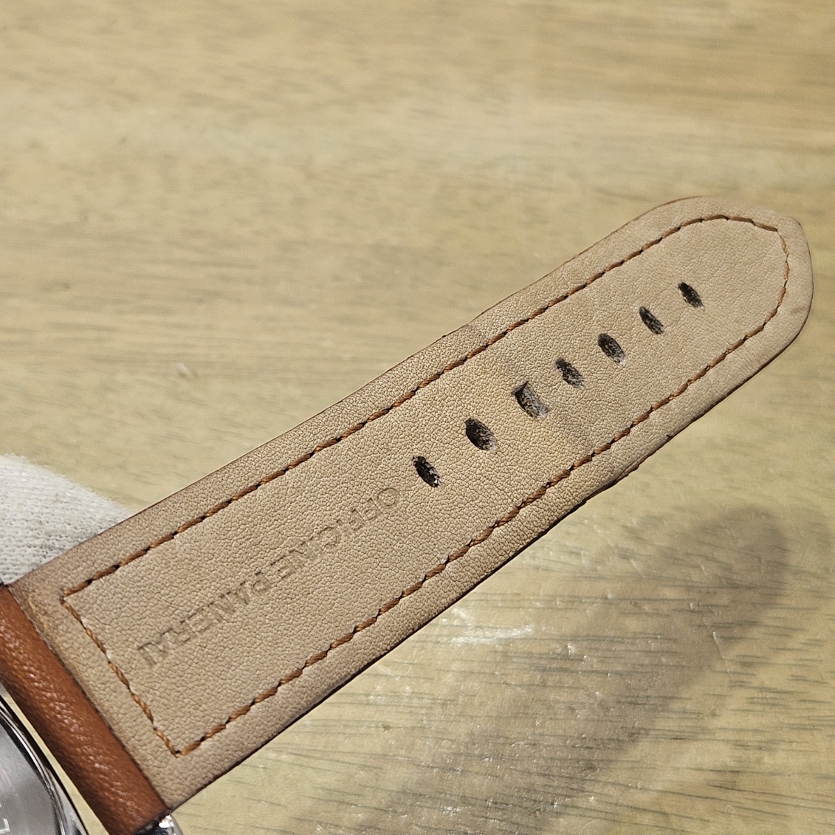 2001年10月。パネライの基礎とも呼べるPAM00001の入荷です。鏡面リューズガード、流し込みダイアル、300m防水、手巻きムーブメントOP.IIを搭載した世界展開第1号モデルとなります。現在のルミノールと比べてもインデックスの緑色が抑えられて白っぽいルミノバ塗料となっておりシックな印象を受けます。全体的に太くぼってりしたインデックスも可愛らしい印象です。24年前のオリジナル風防ですので風防のフチに小さなチップがございますが、大きな傷は無くゴールデンカーフとラバーベルトという新品当時の組み合わせのベルトが綺麗な状態で残っておりますし初期タイプの幅の細いバックルが付属しております。かつての王道モデルですが良個体が年々少なくなっております。3針ルミノールと言えばPAM00001ですのでお探しの方は是非お問い合わせ下さい。 |