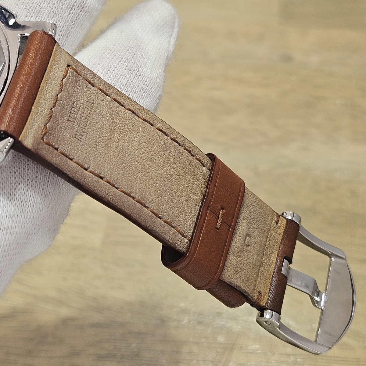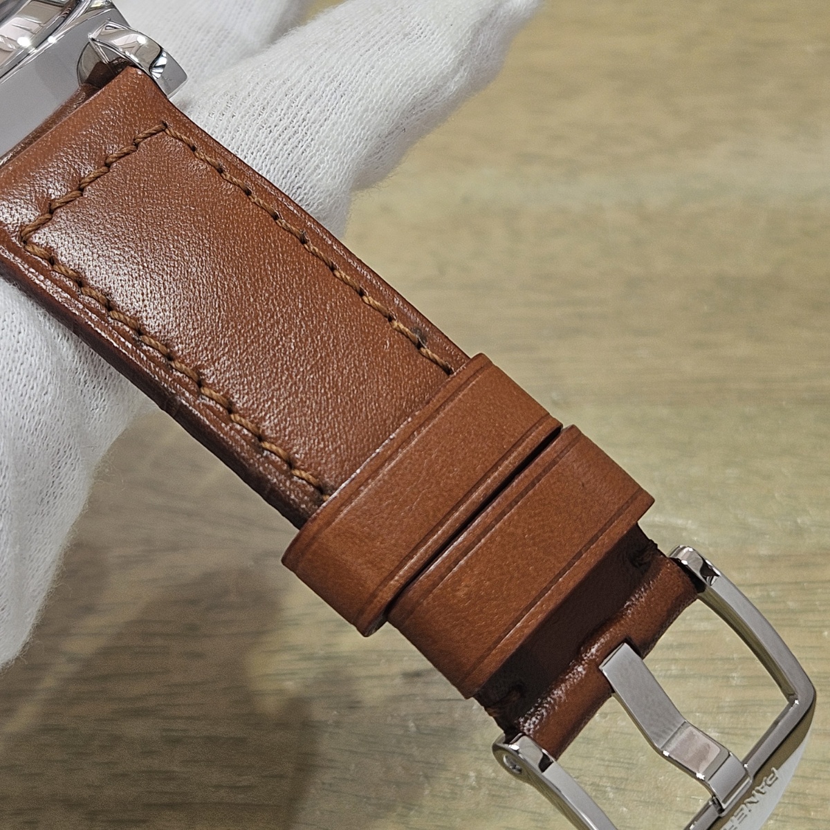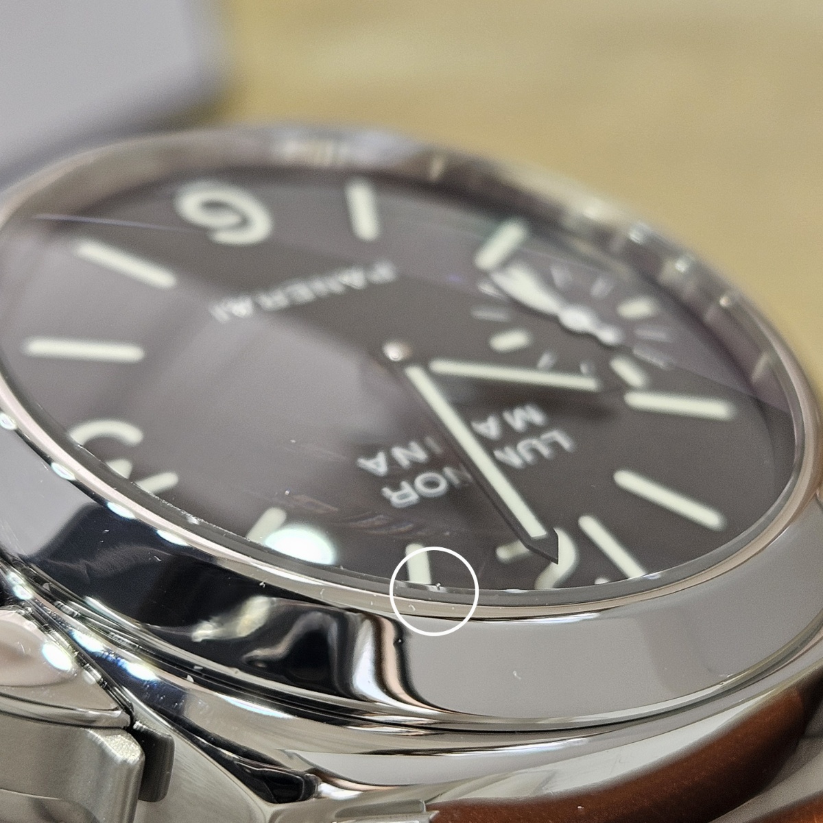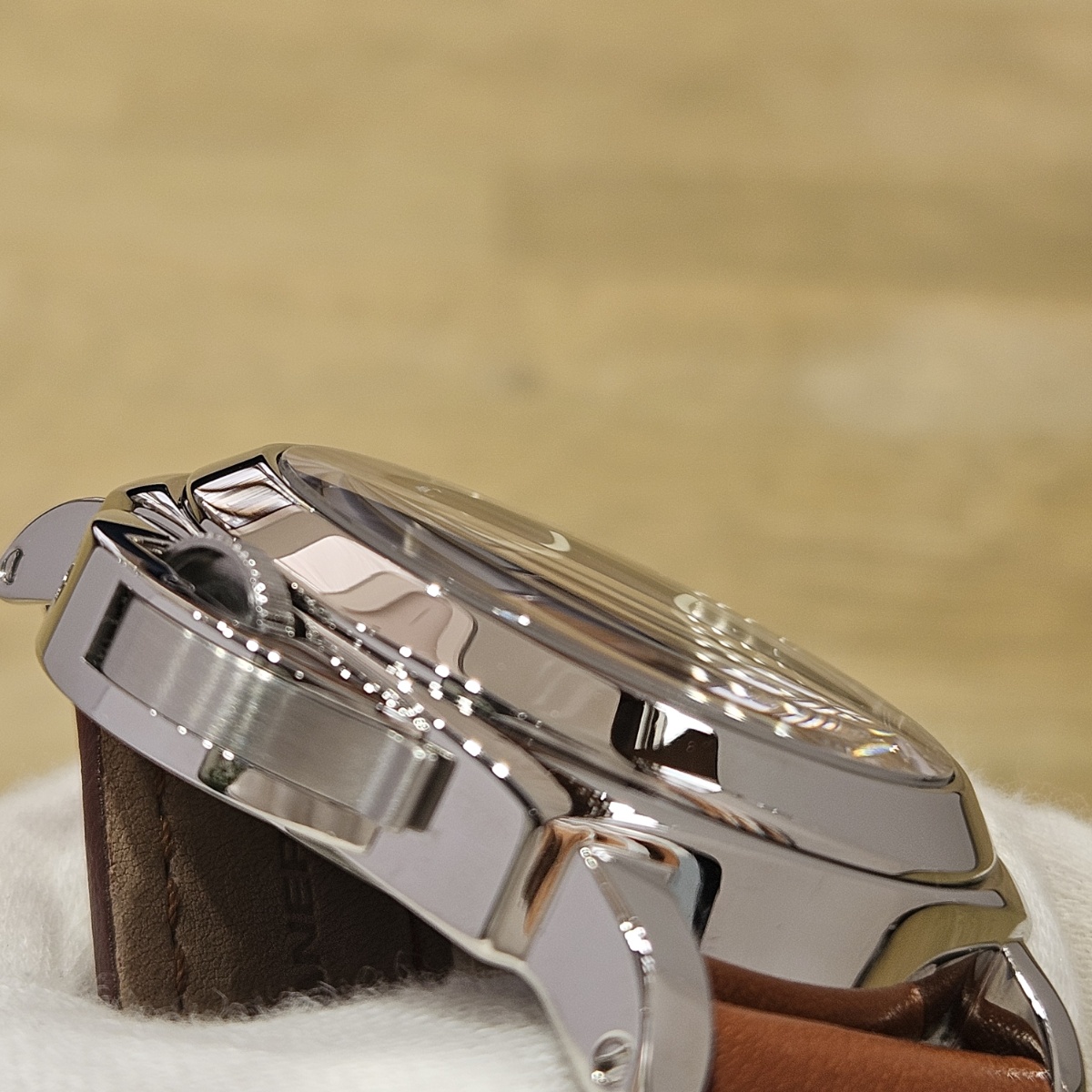 2001年10月。パネライの基礎とも呼べるPAM00001の入荷です。鏡面リューズガード、流し込みダイアル、300m防水、手巻きムーブメントOP.IIを搭載した世界展開第1号モデルとなります。現在のルミノールと比べてもインデックスの緑色が抑えられて白っぽいルミノバ塗料となっておりシックな印象を受けます。全体的に太くぼってりしたインデックスも可愛らしい印象です。24年前のオリジナル風防ですので風防のフチに小さなチップがございますが、大きな傷は無くゴールデンカーフとラバーベルトという新品当時の組み合わせのベルトが綺麗な状態で残っておりますし初期タイプの幅の細いバックルが付属しております。かつての王道モデルですが良個体が年々少なくなっております。3針ルミノールと言えばPAM00001ですのでお探しの方は是非お問い合わせ下さい。 |