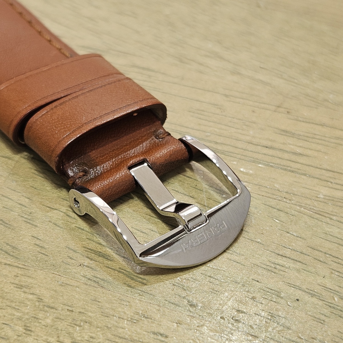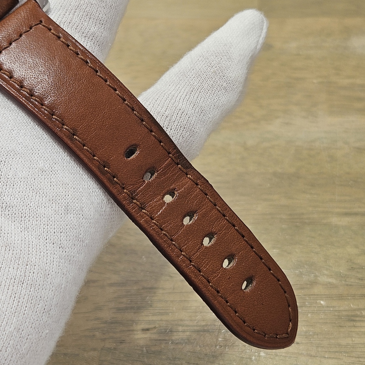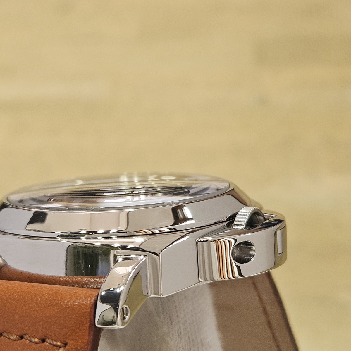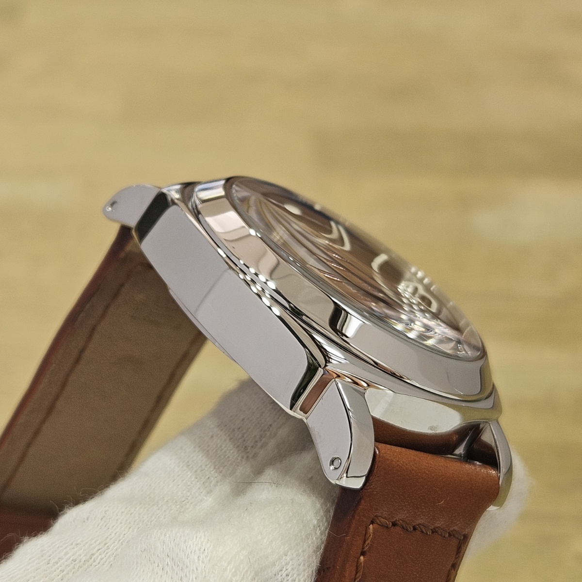 2001年10月。パネライの基礎とも呼べるPAM00001の入荷です。鏡面リューズガード、流し込みダイアル、300m防水、手巻きムーブメントOP.IIを搭載した世界展開第1号モデルとなります。現在のルミノールと比べてもインデックスの緑色が抑えられて白っぽいルミノバ塗料となっておりシックな印象を受けます。全体的に太くぼってりしたインデックスも可愛らしい印象です。24年前のオリジナル風防ですので風防のフチに小さなチップがございますが、大きな傷は無くゴールデンカーフとラバーベルトという新品当時の組み合わせのベルトが綺麗な状態で残っておりますし初期タイプの幅の細いバックルが付属しております。かつての王道モデルですが良個体が年々少なくなっております。3針ルミノールと言えばPAM00001ですのでお探しの方は是非お問い合わせ下さい。 |