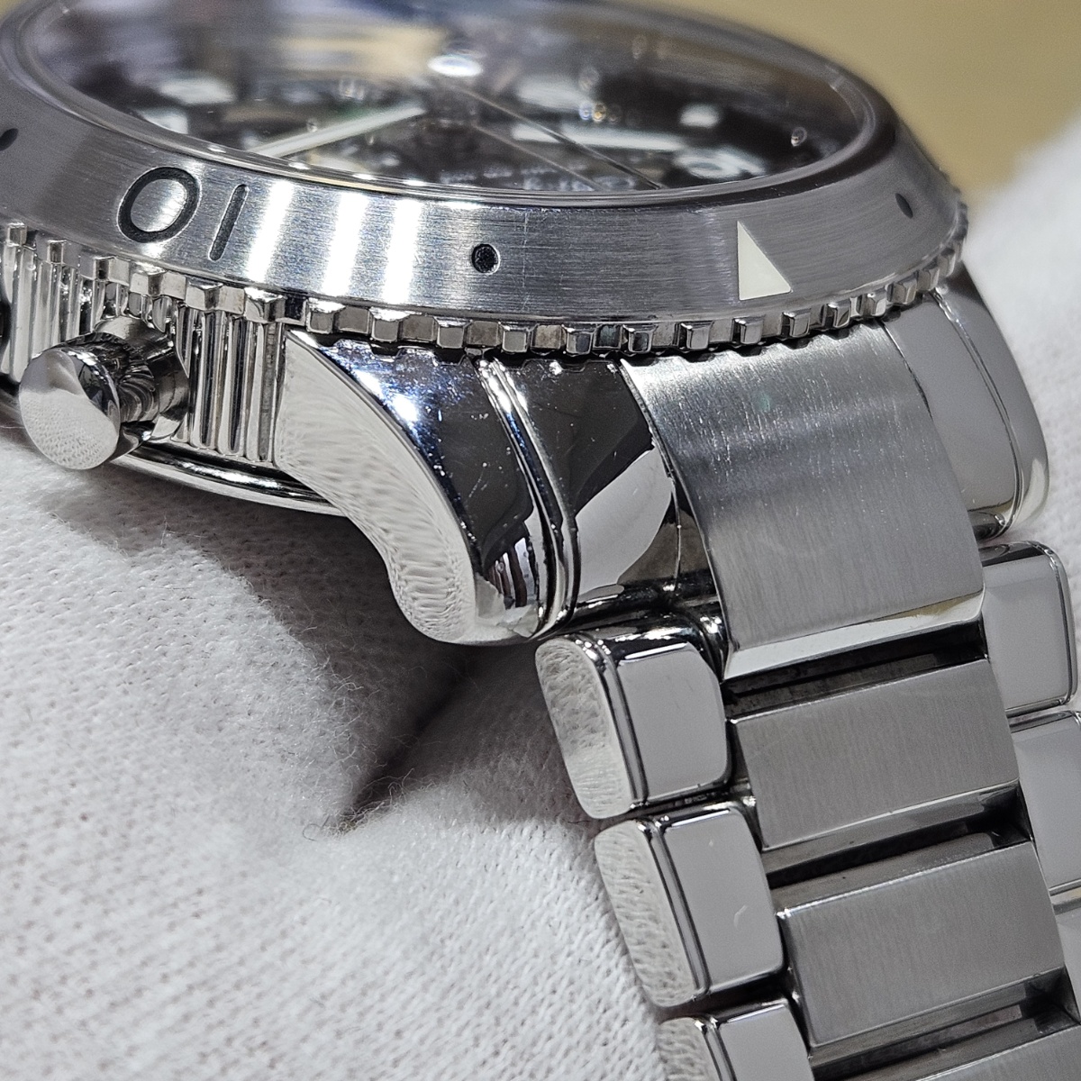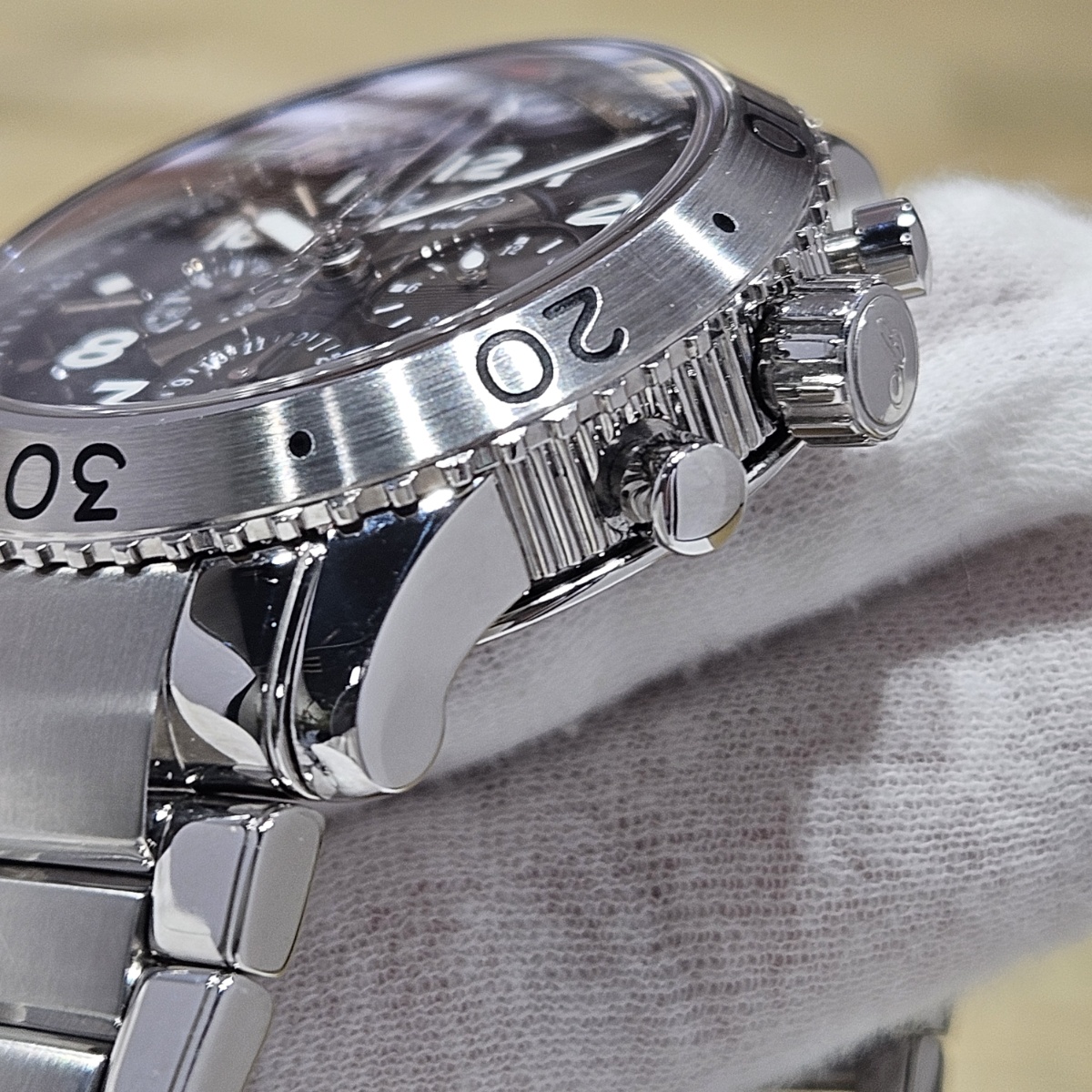 2010年9月。ブレゲの金字塔クロノグラフであるトランスアトランティックの入荷です。文字盤がグレーともブラウンとも言えない独特のカラーリングになっており、フライバッククロノグラフから24時間表示(デイナイト機能)まで付いた多機能モデルとなります。特に24時間計は線の濃淡にて夜間と昼間を表現しており上品な文字盤上の世界観を崩さない秀逸なデザインになっております。12時位置のクロノグラフ針の下に60分積算計針が隠れており同軸クロノグラフとなっている点もメカ好きにはたまらないポイントとなります。フルコマより2コマ足りないため腕周りは18.5cmまでの対応となりますが使用による表面スレのみの綺麗なコンディションとなっております。お探しの方は是非お問い合わせ下さい。 |