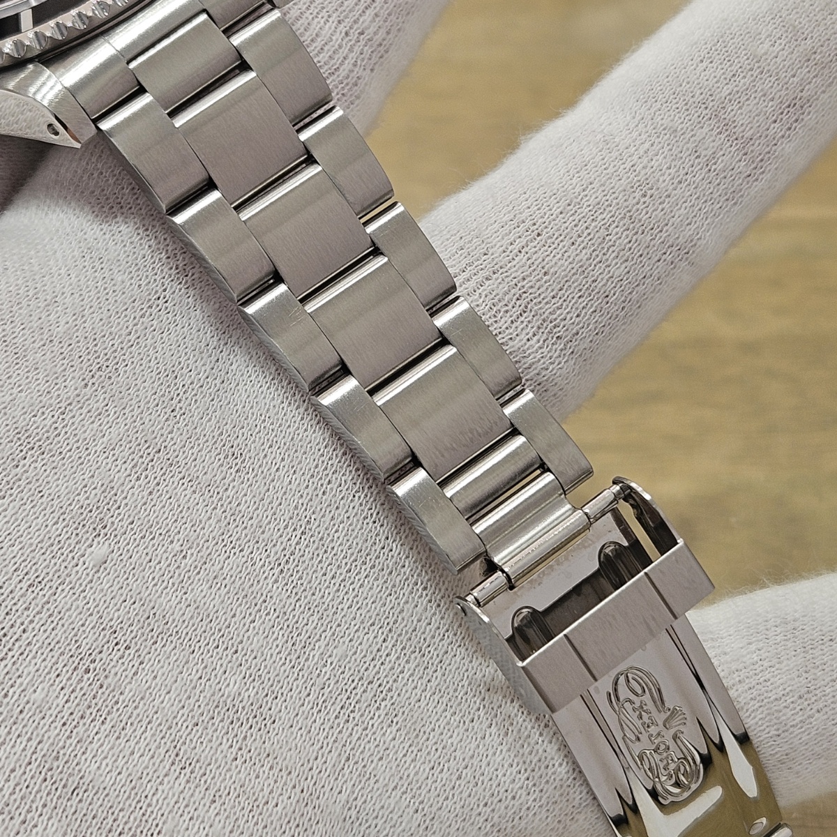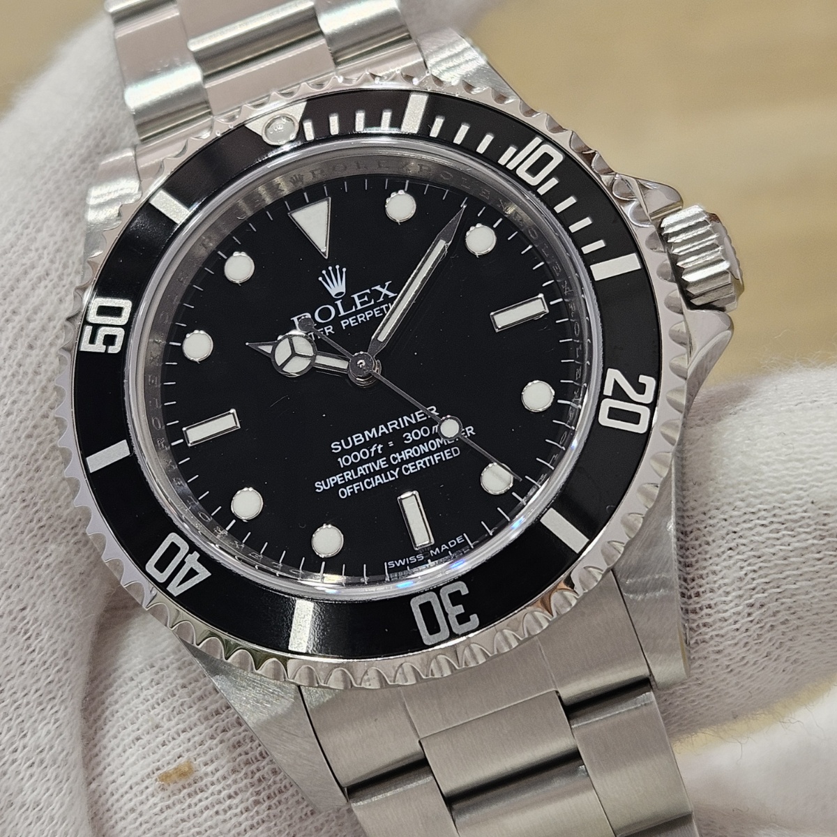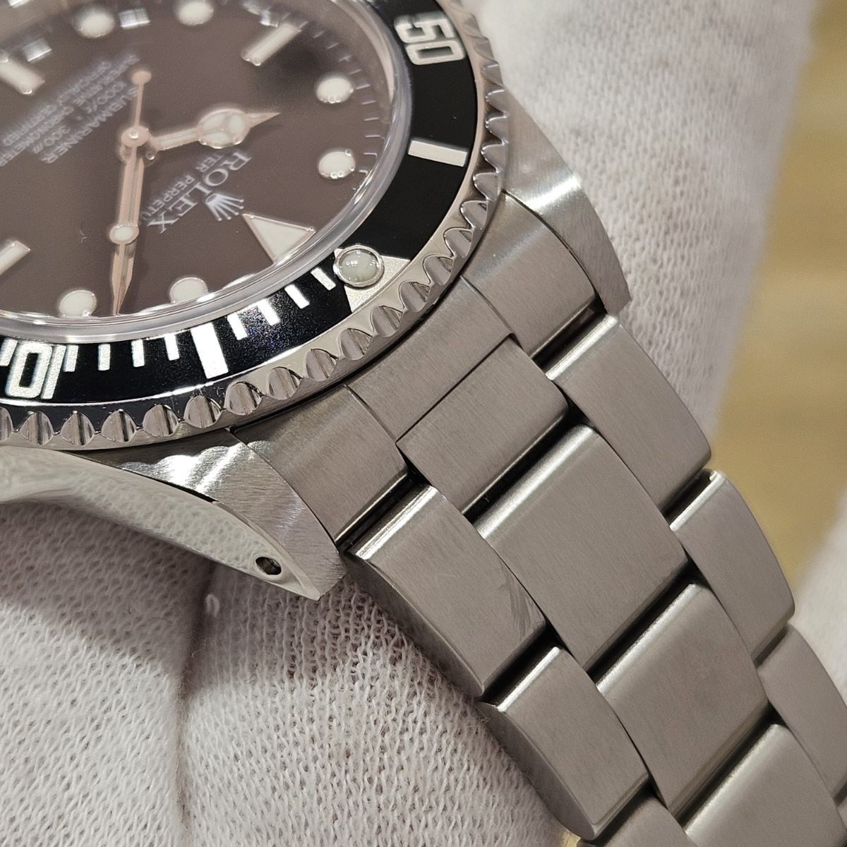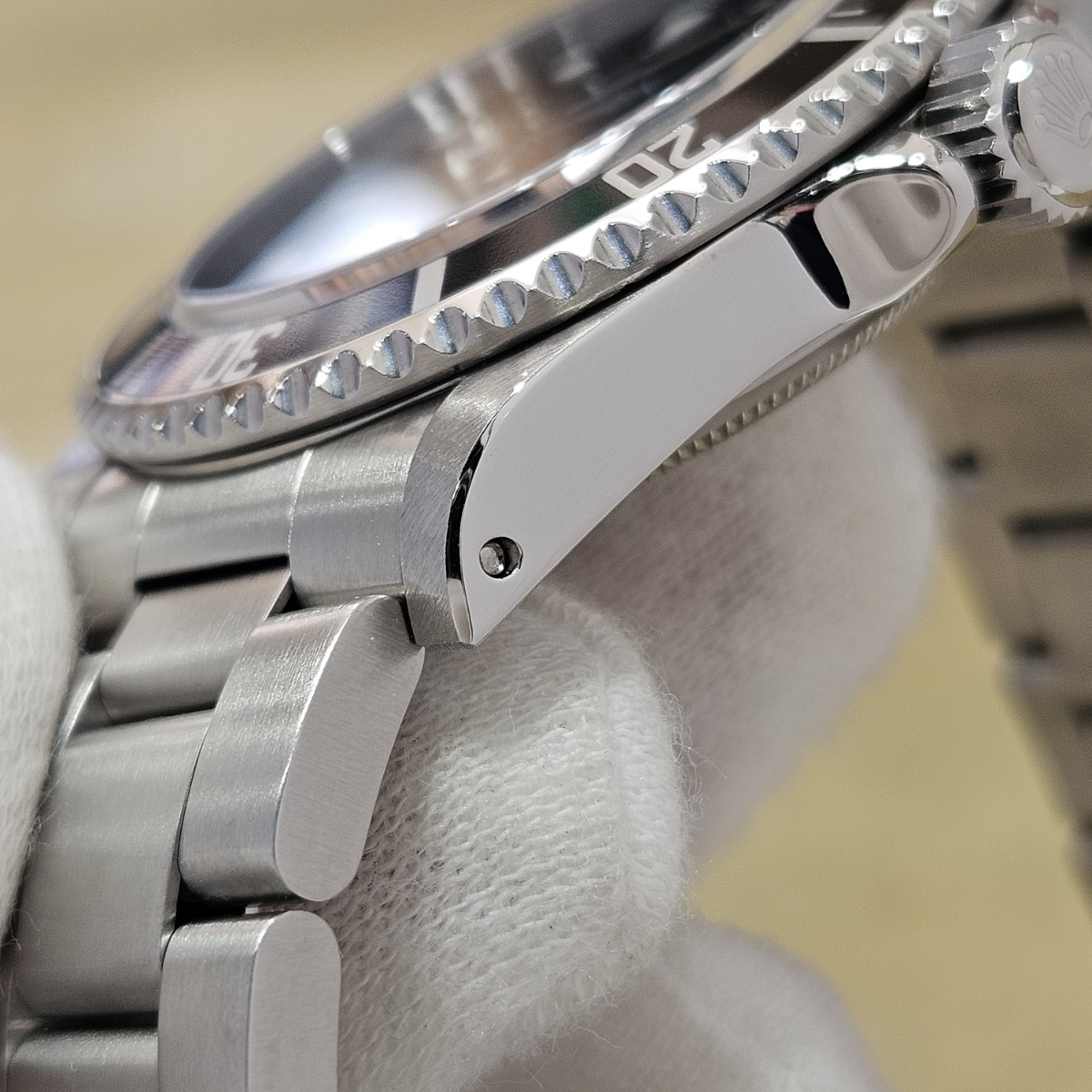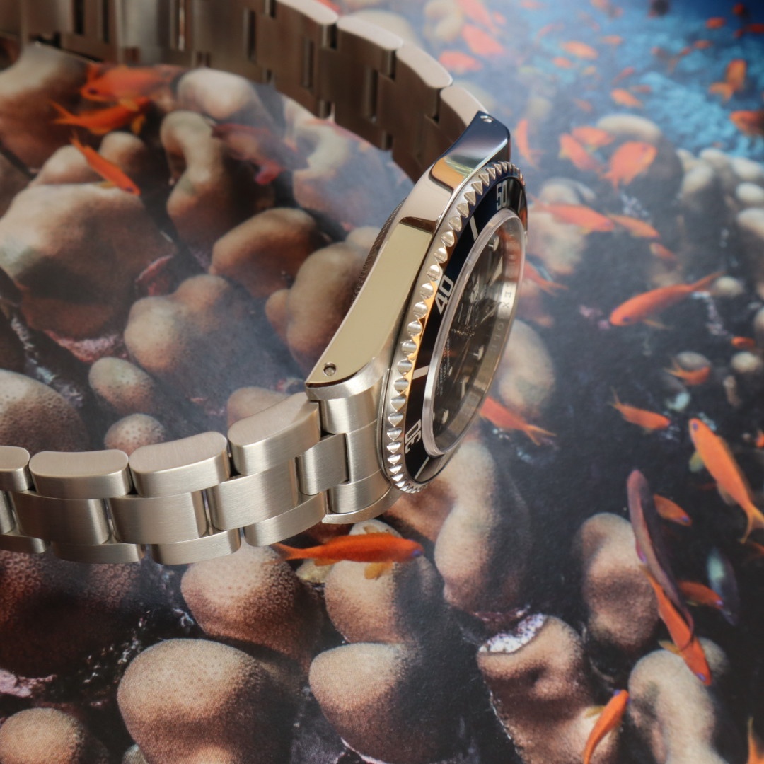 コメント | 2010年8月G番、クラスプコードRS 2010年。交換マーク無のオリジナル透かし入り風防にフルコマの極上状態の1本。唯一のマイナスは5倍拡大で撮影すると髪の毛の1/3位の太さの長さ3mmほどの線スレが風防にありますがそれ以外はラグも綺麗ですしフルコマで精度も+2秒と文句のない1本です。どんどんと重量が増加してマッチョな時計になっていくサブマリーナノンデイトですがこの時代の14060Mはフルコマでも126gと現行品よりも30gも軽く1日着けていても疲れない時計となっております。風防のスレも肉眼ではほとんど見えませんので高年式の極上コンディションの14060Mをお探しの方は是非お問い合わせ下さい。 |