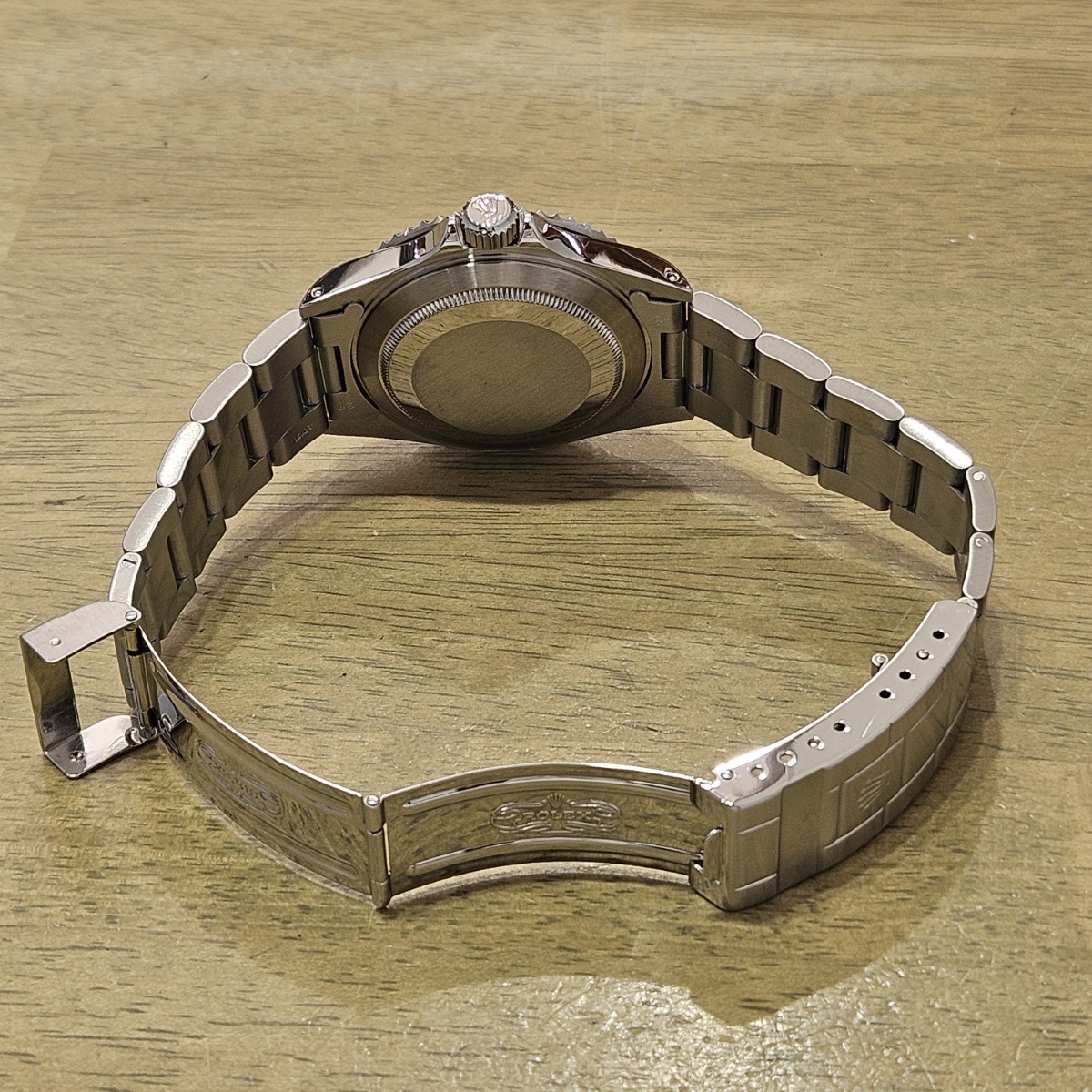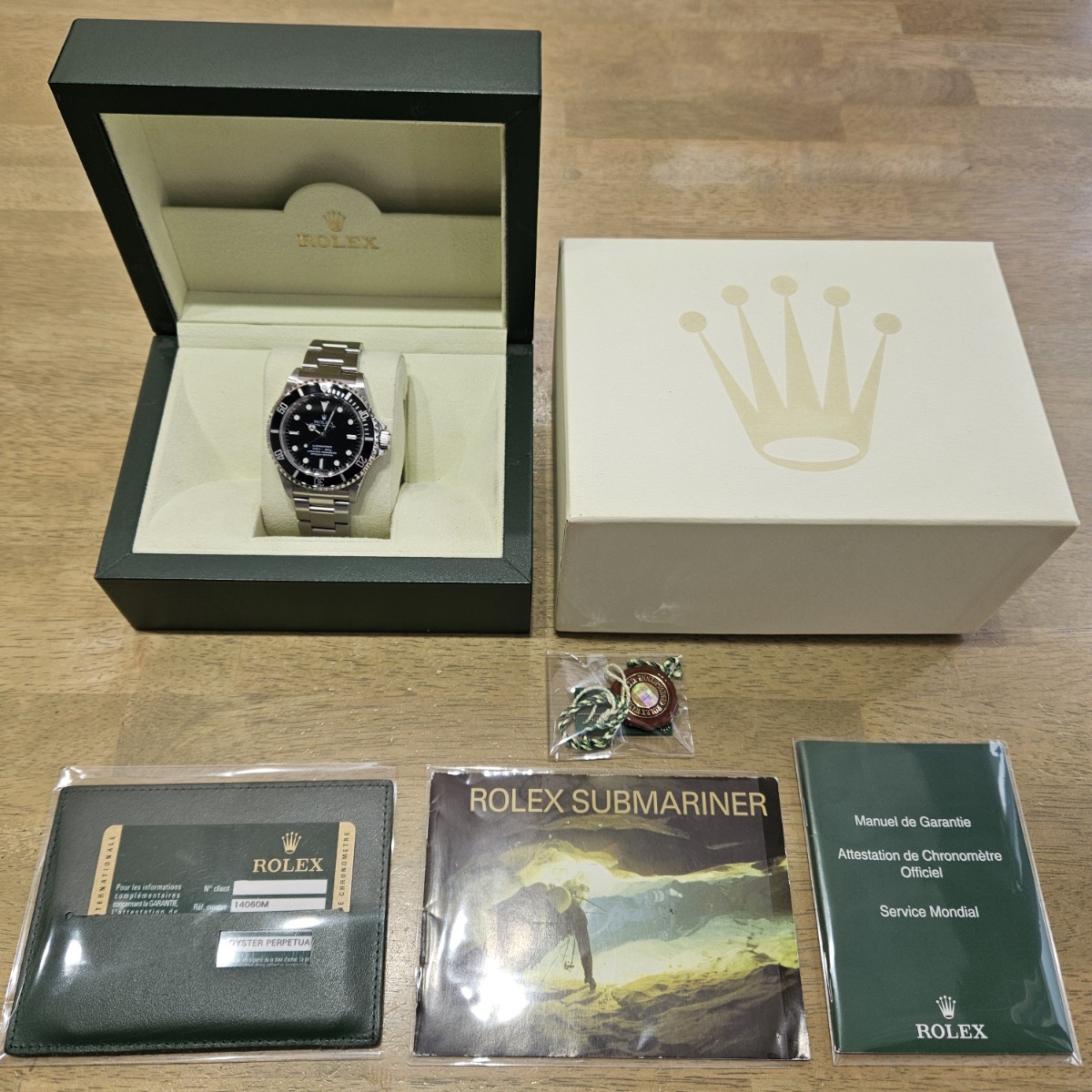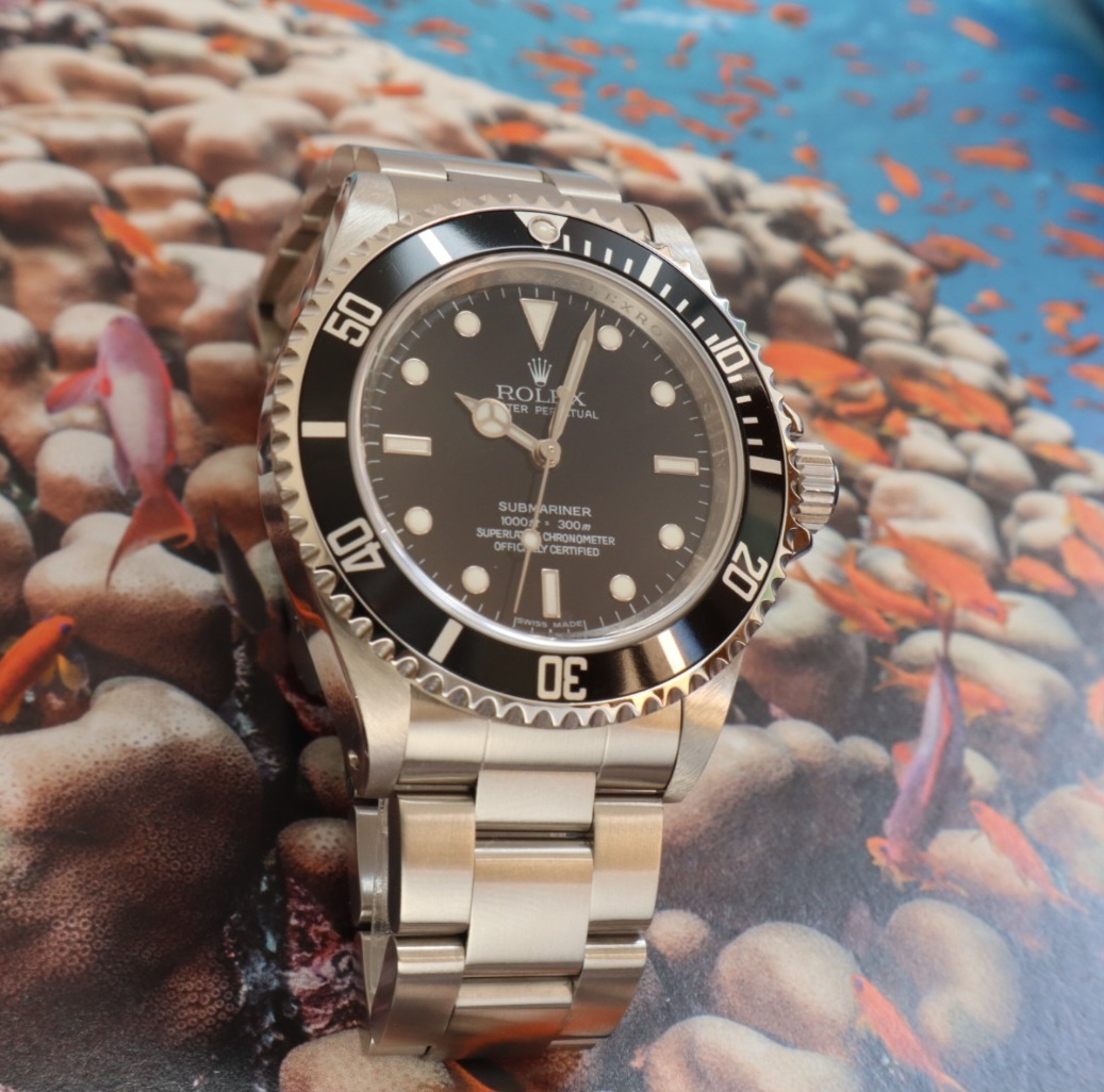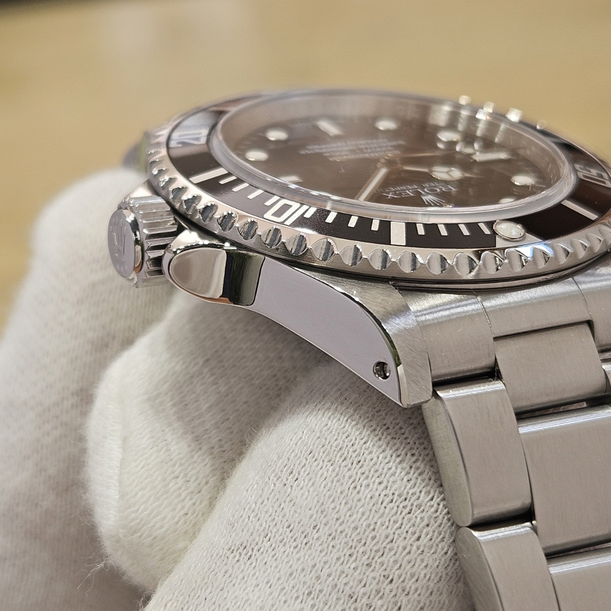 コメント | 2010年8月G番、クラスプコードRS 2010年。交換マーク無のオリジナル透かし入り風防にフルコマの極上状態の1本。唯一のマイナスは5倍拡大で撮影すると髪の毛の1/3位の太さの長さ3mmほどの線スレが風防にありますがそれ以外はラグも綺麗ですしフルコマで精度も+2秒と文句のない1本です。どんどんと重量が増加してマッチョな時計になっていくサブマリーナノンデイトですがこの時代の14060Mはフルコマでも126gと現行品よりも30gも軽く1日着けていても疲れない時計となっております。風防のスレも肉眼ではほとんど見えませんので高年式の極上コンディションの14060Mをお探しの方は是非お問い合わせ下さい。 |