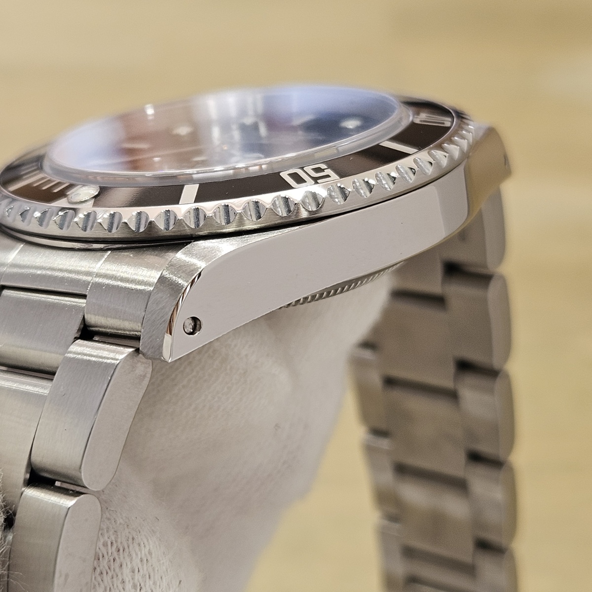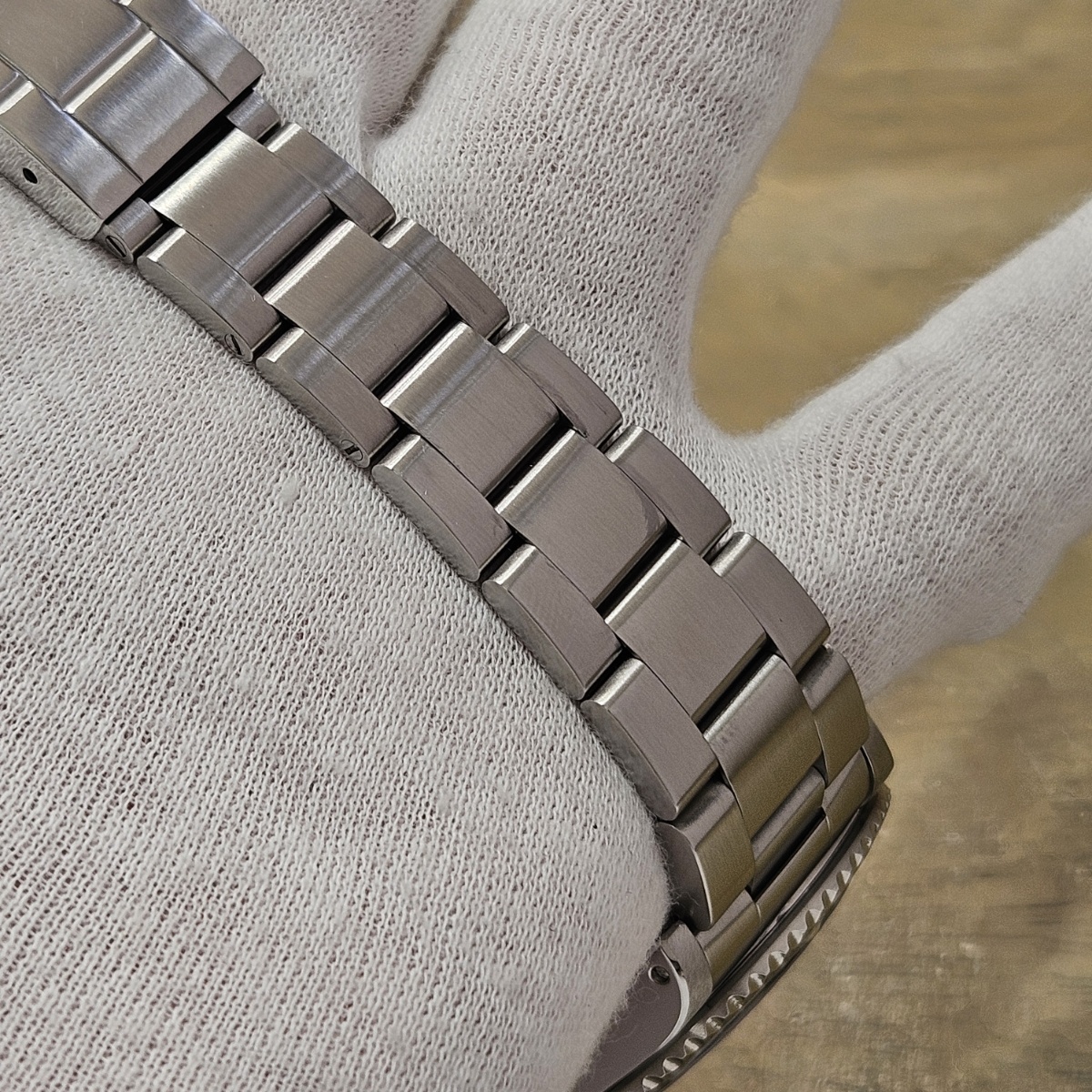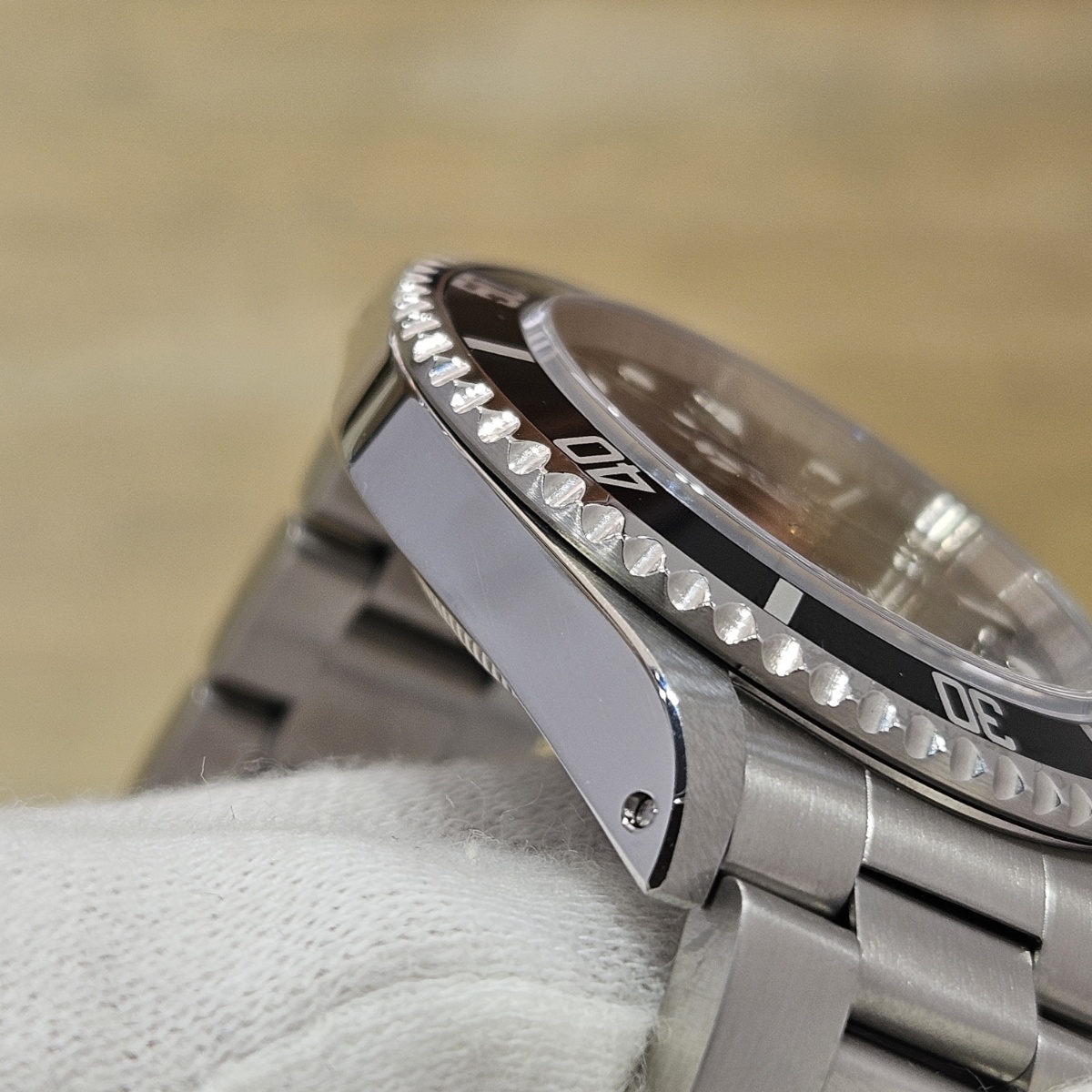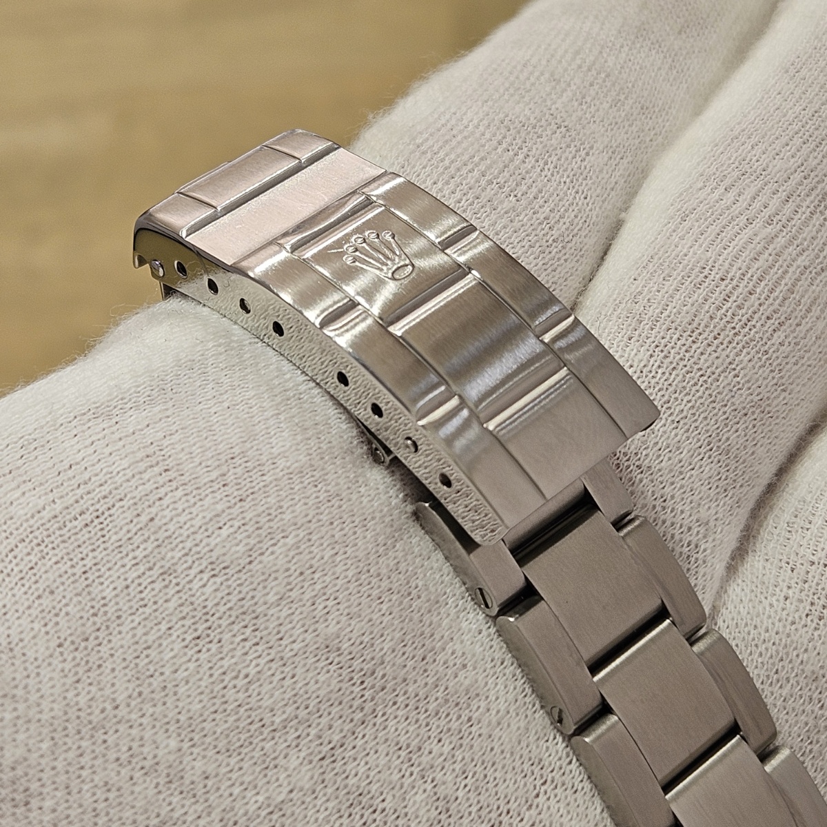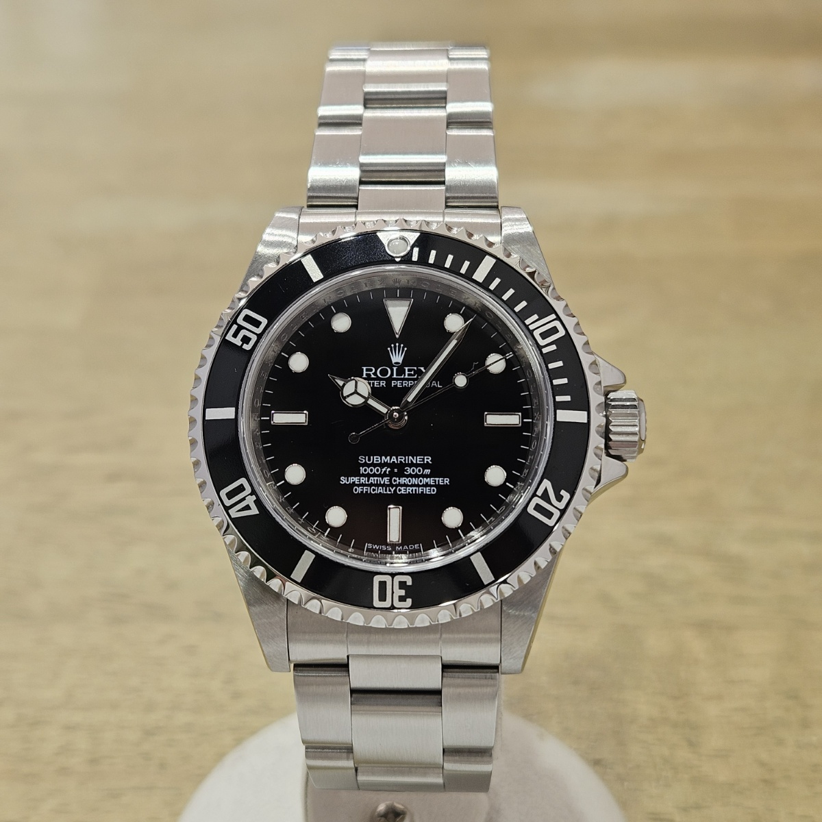 コメント | 2010年8月G番、クラスプコードRS 2010年。交換マーク無のオリジナル透かし入り風防にフルコマの極上状態の1本。唯一のマイナスは5倍拡大で撮影すると髪の毛の1/3位の太さの長さ3mmほどの線スレが風防にありますがそれ以外はラグも綺麗ですしフルコマで精度も+2秒と文句のない1本です。どんどんと重量が増加してマッチョな時計になっていくサブマリーナノンデイトですがこの時代の14060Mはフルコマでも126gと現行品よりも30gも軽く1日着けていても疲れない時計となっております。風防のスレも肉眼ではほとんど見えませんので高年式の極上コンディションの14060Mをお探しの方は是非お問い合わせ下さい。 |